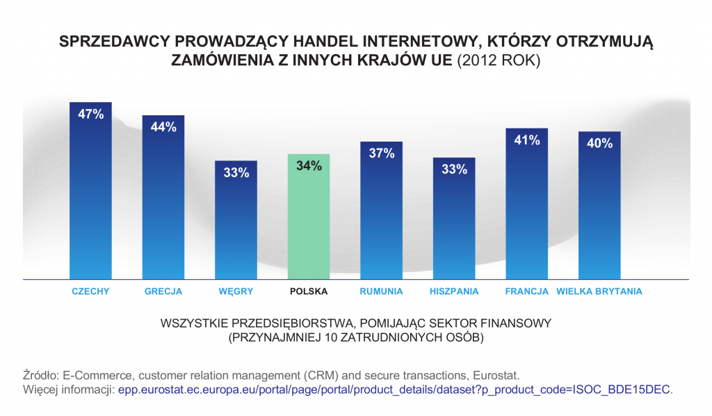 Przyjmując szerszą perspektywę, globalne dane wyraźnie wskazują że eksport online wciąż dynamicznie rośnie – niezależnie od zmniejszającego się, w przypadku wielu gospodarek, lokalnego i tradycyjnego eksportu. Ten trend jest widoczny zwłaszcza wewnątrz EU 27, gdzie koszty wysyłki są stosunkowo niskie, a opłaty celne nie występują. Na rok 2012, przynajmniej 11 proc. polskich sprzedawców sprzedawało online, a 34 proc. z nich otrzymało zamówienia z innych krajów europejskich.