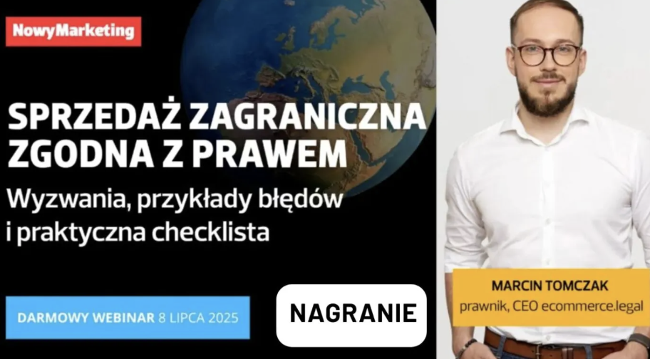 - Ekspansja zagraniczna to szansa dla twojego e-commerce. Jak sprzedawać za granicą i uniknąć przy tym błędów, spełnić lokalne przepisy i nie narazić się na kary? Podczas webinaru „Sprzedaż zagraniczna zgodna z prawem – wyzwania, przykłady błędów i praktyczna checklista”, radca prawny Marcin Tomczak podzielił się kompleksową wiedzą o tym, jak bezpiecznie wejść na rynki zagraniczne ze swoją ofertą e-commerce. >>> Zobacz nagranie.