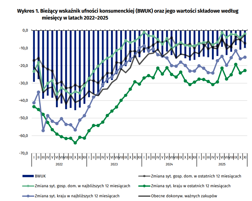 - Oceny nastrojów konsumenckich w Polsce dokonał natomiast GUS, Według ostatniego odczytu wskaźnika ufności konsumenckiej, jego wartość wzrosła do –9,9 punktów procentowych (z –10,9 w październiku), co oznacza, że nastroje konsumentów w Polsce lekko się poprawiły. Poprawie uległy oceny możliwości robienia ważnych zakupów oraz przyszłych perspektyw finansowych gospodarstw domowych.