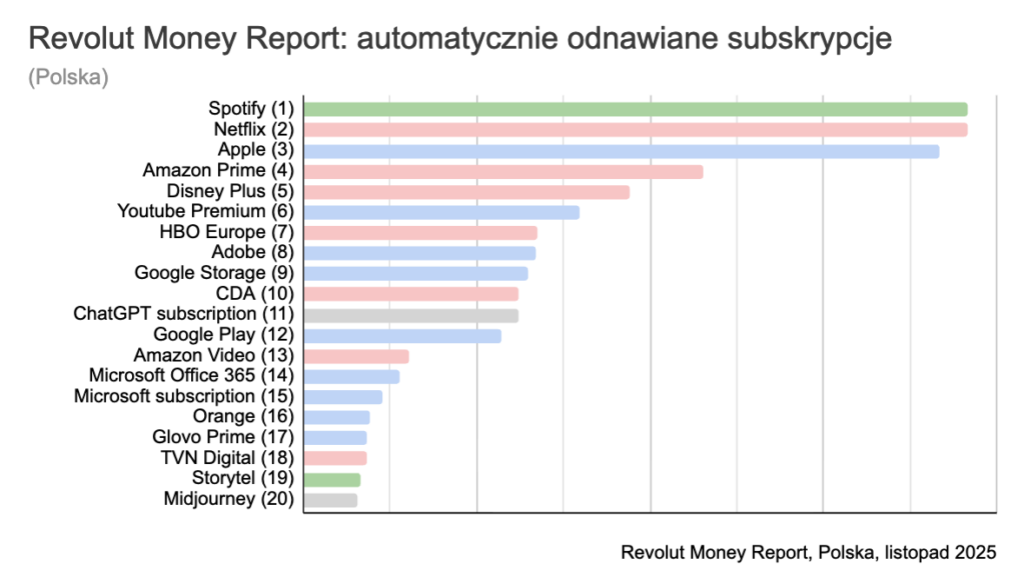 - Z analizy „Revolut Money Report” wynika, że w TOP3 automatycznie odnawianych subskrypcji przez klientów Revolut w Polsce znalazły się kolejno subskrypcje Spotify, Netflix i Apple, tuż za podium uplasował się Amazon Prime. Zobacz pozostałe wnioski. Czytaj więcej >>