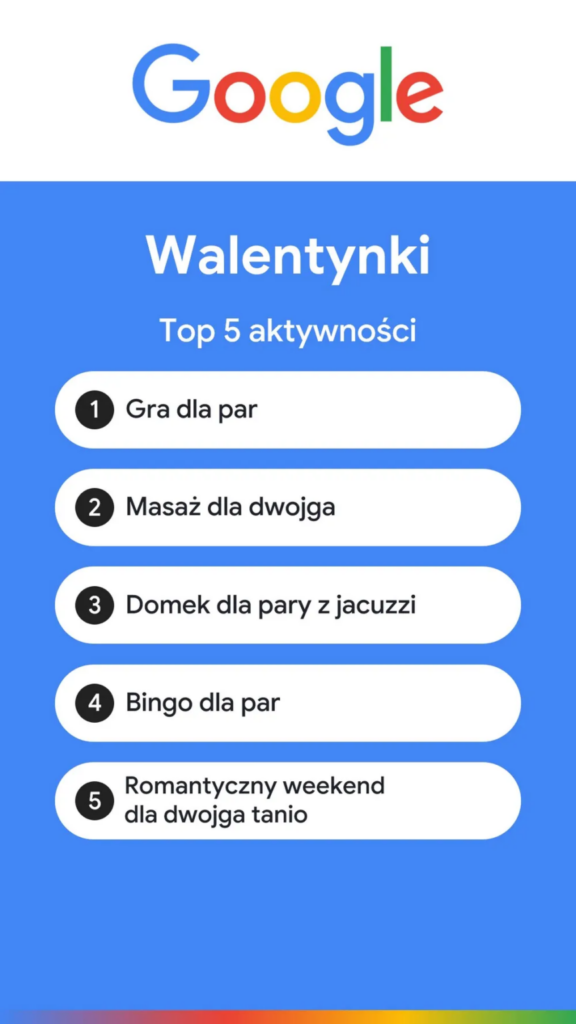 • Polacy coraz częściej odchodzą od tradycyjnej walentynkowej kolacji przy świecach i szukają głębszej jakości wspólnie spędzanego czasu. Google opublikował raport oparty na najnowszych danych z wyszukiwania na Walentynki 2026.