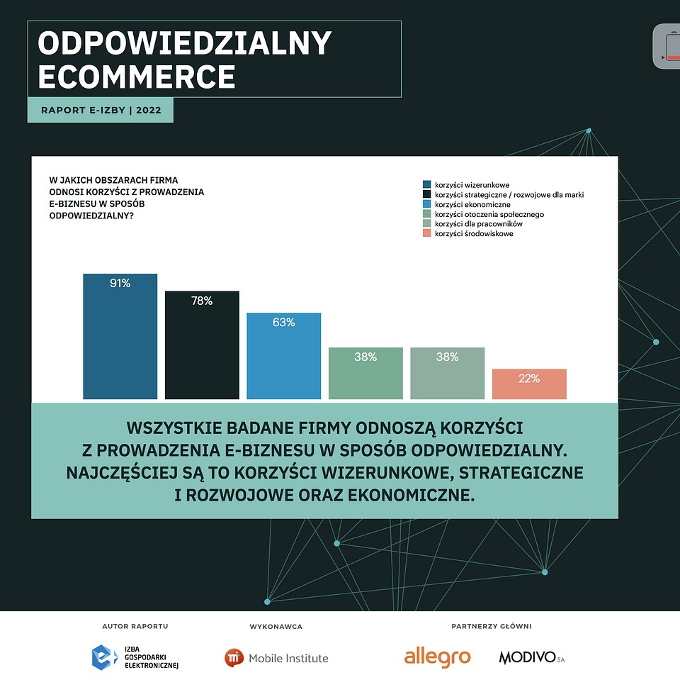 Menadżerki i menadżerowie tej branży jednogłośnie oceniają, że e-biznes jest prowadzony w sposób zrównoważony. Aż 83% z nich potwierdziło, że taki sposób zarządzania wynika z wartości wyznawanych w firmie. Wytyczone kierunki odpowiedzialnego e-biznesu ma – podobnie jak rok temu – około połowa firm (47%), a zrównoważony rozwój znalazł swoje miejsce w strategii 60% podmiotów.