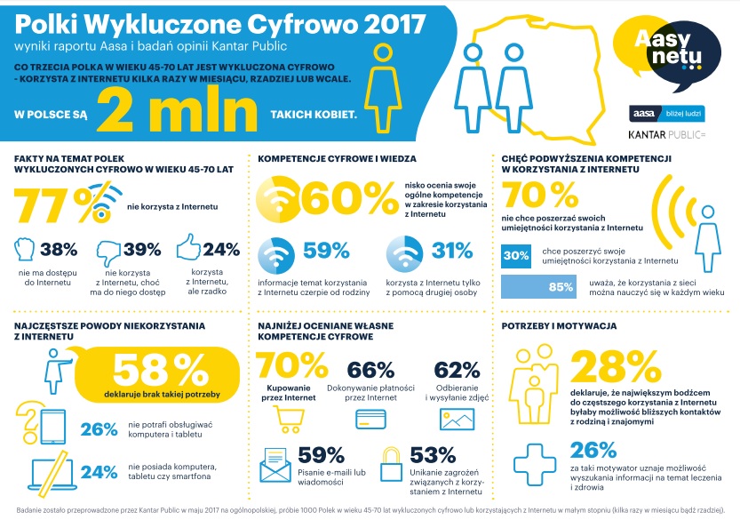 Kobiety między 45. a 70. rokiem życia, które rzadko lub w ogóle nie korzystają z Internetu, zwykle bardzo nisko oceniają swoje kompetencje cyfrowe. Ponad połowa z nich jako niedostateczne ocenia swoje umiejętności związane z obsługą komputera (59 proc.) i wyszukiwaniem informacji w sieci (57 proc.). W konsekwencji proste aktywności podejmowane w Internecie są przez nie jeszcze częściej oceniane krytycznie. Takie są wyniki Raportu Aasa – Polki Wykluczone Cyfrowo 2017, opracowanego na podstawie badania opinii zrealizowanego przez Kantar Public.