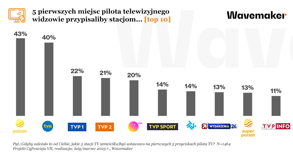 Polsat i TVN – z dużą przewagą nad TVP 1, TVP2 i TVN7 znalazłyby się na pierwszych pięciu miejscach pilota, gdyby decydowali o tym polscy widzowie. W świeżo zakończonym badaniu Projekt Cyfrowizja VII agencji Wavemaker, widzowie wybierali swoje top 5 stacji z listy dostępnych w Polsce kanałów naziemnych, a więc tych, do których bezpłatny dostęp mogą mieć wszyscy lub większość polskich odbiorców TV.
