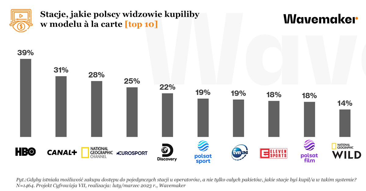 Z nieco większym zainteresowaniem niż w poprzedniej fali badania Wavemaker z 2021 r., polscy widzowie przyjęliby za to możliwość kupowania u operatorów płatnej TV dostępu do pojedynczych stacji telewizyjnych. Przypomnijmy, że zobowiązanie operatorów do sprzedaży kanałów w takim modelu również jest dyskutowane w ramach projektu Lex Pilot.