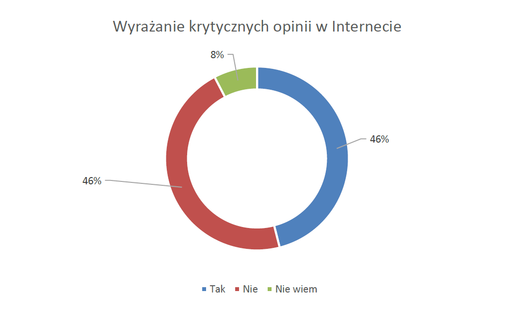 46% osób przyznaje, że zdarzyło im się wyrazić krytyczne opinie na jakiś temat w Internecie. Bardziej skłonni do wyrażania negatywnych opinii są mężczyźni (52%) niż kobiety (40%). Spośród grup wiekowych to osoby najmłodsze (15-24 lata) najczęściej krytykują w sieci (55%). Wykształcenie nie ma tutaj żadnego znaczenia – osoby z wykształceniem wyższym krytykują tak samo często jak osoby z wykształceniem średnim czy podstawowym.