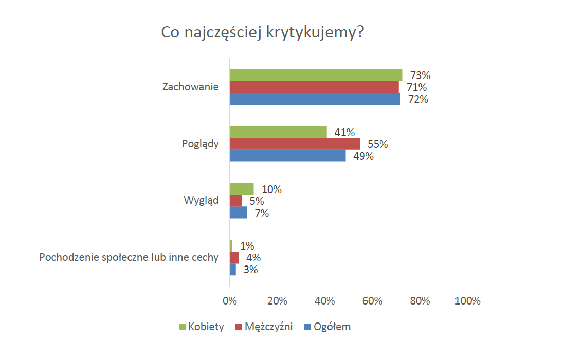 Zdecydowanie najczęściej krytykowane jest czyjeś zachowanie. Istnieją spore różnice między tym, co krytykują mężczyźni, a co kobiety. Kobiety dwukrotnie częściej krytykują wygląd, zaś mężczyźni dużo częściej poglądy. Wygląd też jest częściej krytykowany przez ludzi młodych – do 34 roku życia, zaś poglądy wśród osób z najstarszej badanej grupy wiekowej – powyżej 45 roku życia.
