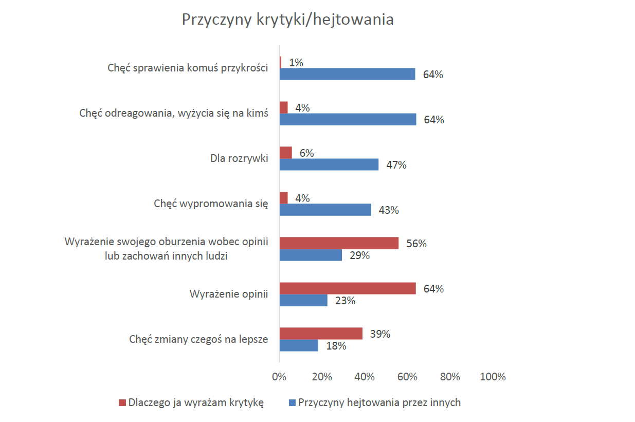 Badani zupełnie inaczej postrzegają wyrażanie krytycznych opinii przez siebie niż ze strony innych osób. Tylko 1% badanych przyznaje, że swoją krytyką chce sprawić komuś przykrość, ale aż 64% jest przekonanych, że inni mają taki cel. Podobnie jest z chęcią odreagowania. Oceniając siebie tylko 4% osób przyznaje, że krytykując coś odreagowują, zaś 64% uważa, że to inni chcą odreagować. Mówiąc o sobie najczęściej respondenci wskazywali chęć wyrażenia opinii. Mówiąc o innych – chęć sprawienia komuś przykrości. Warto zwrócić uwagę, że odsetek osób przyznających się do krytykowania „dla rozrywki” jest w przypadku osób najmłodszych ponad czterokrotnie wyższy (9%) niż w przypadku osób z grupy wiekowej 45+ (2%). Krytykowanie „dla rozrywki” jest też dziesięciokrotnie wyższe w przypadku osób z wykształceniem podstawowym i zawodowym (20%) niż z wykształceniem wyższym (1%).
