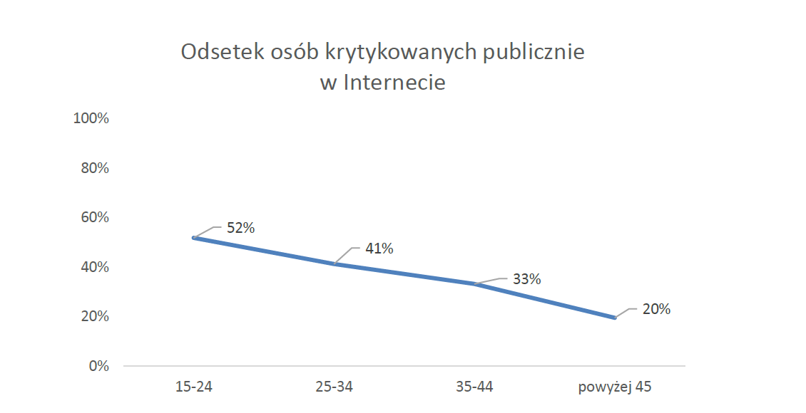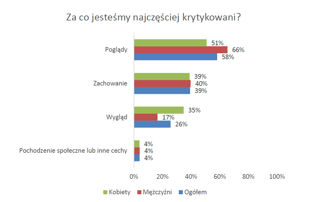 Co trzecia kobieta doświadczyła krytyki swojego wyglądu w sieci, a dwie trzecie mężczyzn – krytyki poglądów. Krytyki poglądów częściej doświadczyli ludzie wykształceni (65% wśród osób z wykształceniem wyższym) i osoby powyżej 45 roku życia (82%).