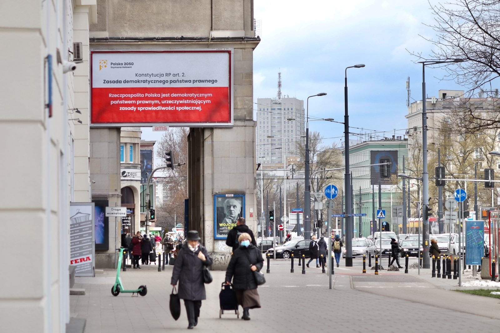 Na tle flagi państwowej została wydrukowana Zasada demokratycznego państwa prawnego, zawarta w art. 2 Konstytucji: „Rzeczpospolita Polska jest demokratycznym państwem prawnym, urzeczywistniającym zasady sprawiedliwości społecznej.” To wszystko. Prosta forma, pozbawiona komentarza treść. Jedynie logo Polski 2050 Szymona Hołowni w lewym górnym rogu wskazuje na organizatora akcji. Całość z daleka rzuca się w oczy. Tak wyglądający billboard pojawił się dziś na ścianie budynku u zbiegu Alei Solidarności i Jana Pawła II w Warszawie.