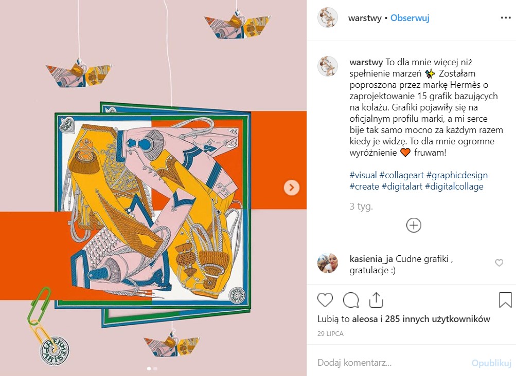 Na zlecenie domu mody artystka zaprojektowała 15 kolaży, wykorzystujących produkty marki. Jej prace pojawiły się na oficjalnych profilach Hermès w mediach społecznościowych.