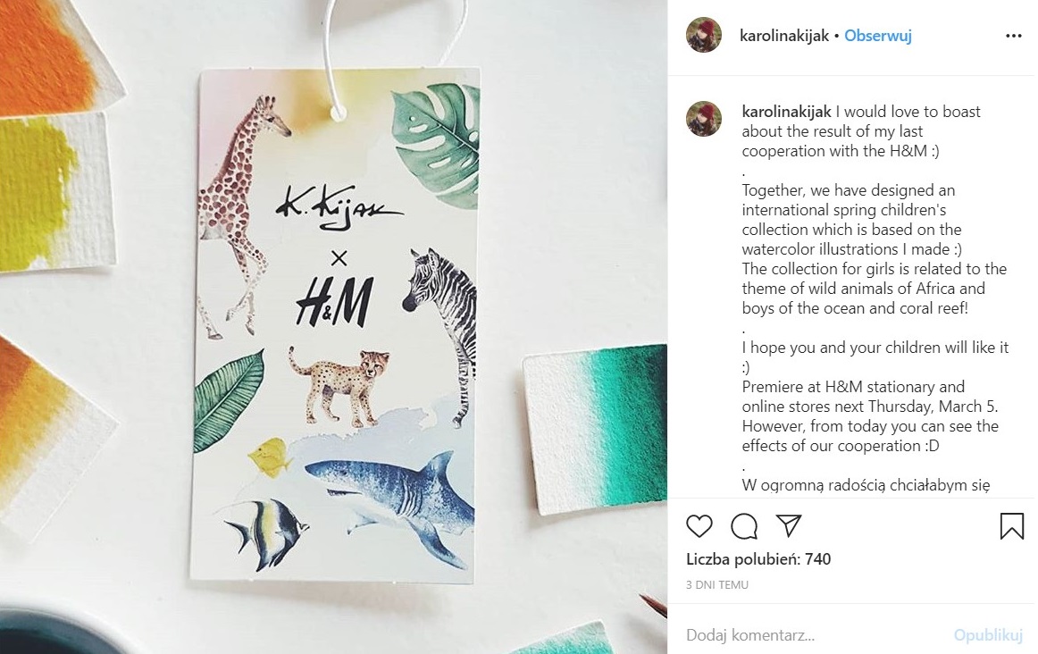 Teraz grafiki polskiej ilustratorki Karoliny Kijak zdobią ubrania z nowej, wiosennej kolekcji marki H&M dla najmłodszych. Artystka stworzyła serię akwarelowych ilustracji, przedstawiających podobizny zwierząt, takich jak m.in. żyrafa, rekin, flaming czy też gepard.