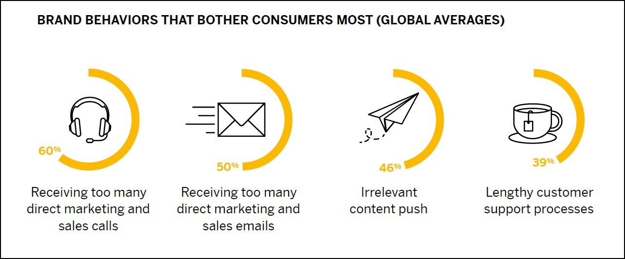 Jest kilka czynników, na które globalni konsumenci są wyczuleni. Najwięcej badanych zadeklarowało, że przeszkadza im natarczywy kontakt w postaci dużej liczby telefonów z ofertami reklamowymi i sprzedażowymi (60%) oraz licznych wiadomości email (50%).