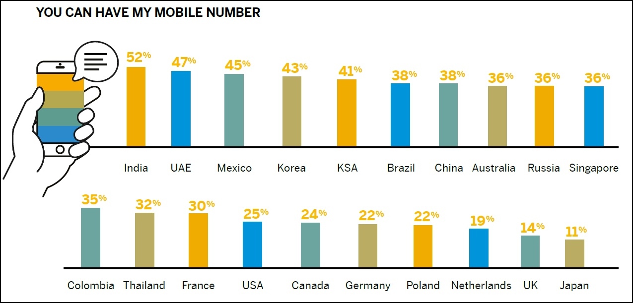 Jeśli chodzi o gotowość do dzielenia się e-mailem, w Polsce deklaruje ją 44% konsumentów. Mniej chętnie udostępniamy swój numer telefonu, jedynie 22% badanych jest skłonnych to uczynić. W tym przypadku, w porównaniu z innymi krajami, znajdujemy się na końcu listy.
