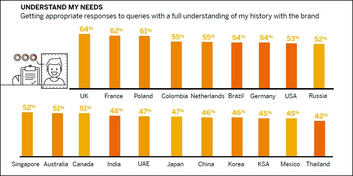 Dzisiejszy konsument oczekuje od marki przede wszystkim zrozumienia potrzeb. Deklaruje to aż 61% polskich klientów, co stawia nas na 3 miejscu – silniejszą potrzebę zrozumienia deklarują jedynie Francuzi (62%) i Brytyjczycy (64%). Istotna jest także personalizacja przekazu, treści i ofert. Dla 61% polskich konsumentów jest to ważny czynnik w kontakcie z marką.