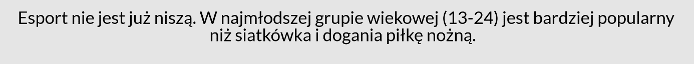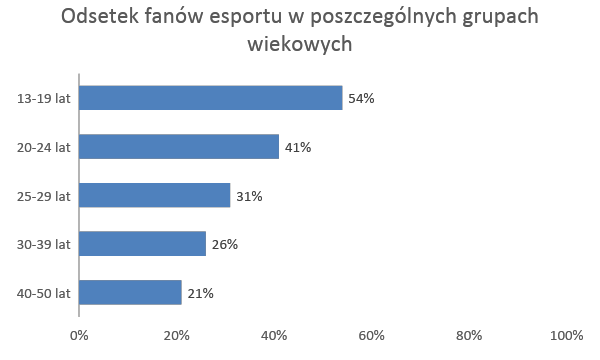 Wprawdzie największy odsetek osób zainteresowanych esportem można zaobserwować w grupie osób najmłodszych (w wieku 13-19 lat), należy jednak zwrócić uwagę na wysoki poziom penetracji zjawiska również w grupach starszych. Odsetek osób zainteresowanych esportem wśród osób w wieku 20-29 lat jest mniejszy w stosunku do nastolatków, wciąż jednak fani esportu stanowią zauważalną grupę. Co ważne, również w najstarszej grupie wiekowej co piąty respondent przyznaje, że ogląda rozgrywki esportowe.