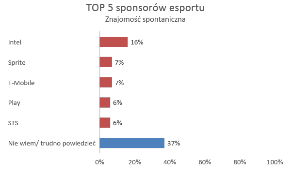 Tylko jedna firma spośród sponsorów esportu ma znajomość spontaniczną wśród graczy na poziomie wyższym niż 10% – jest to Intel. Aż 37% fanów esportu nie potrafi spontanicznie wymienić żadnego sponsora, a zdecydowana większość sponsorów ma znajomość spontaniczną na poziomie niższym niż 5%.