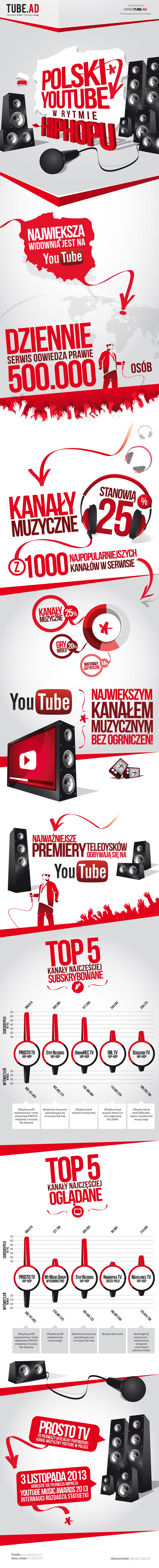 Pierwsze 5 pozycji spośród kanałów muzycznych najczęściej subskrybowanych na YouTube zajmują profile o tematyce hip-hopowej. Prosto TV (wydawnictwo i marka odzieżowa), zajmuje najwyższe miejsce na podium. Jest też pierwszym oficjalnym partnerskim kanałem muzycznym w Polsce. W dniu 4 października 2013 roku Prosto TV mogła odnotować 696.815 subskrypcji i 390.101.453 wyświetleń. Kolejne miejsca zajmują wytwórnie muzyczne: Step Records i UrbanRec TV. TOP 5 zamyka grupa HempGru i donGURALesko.