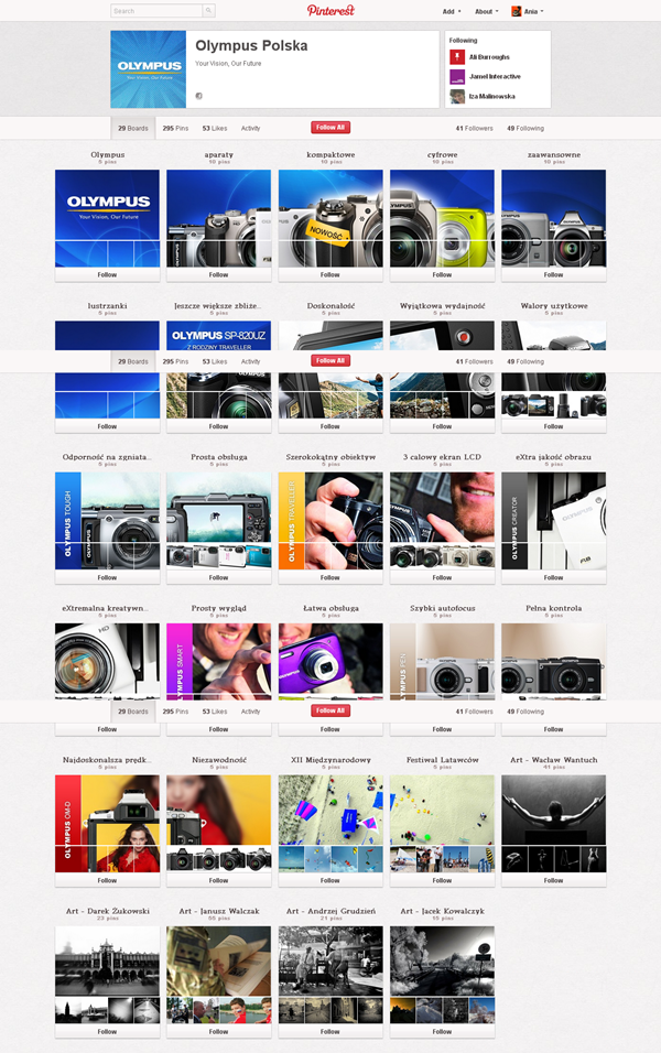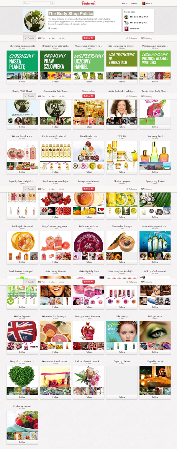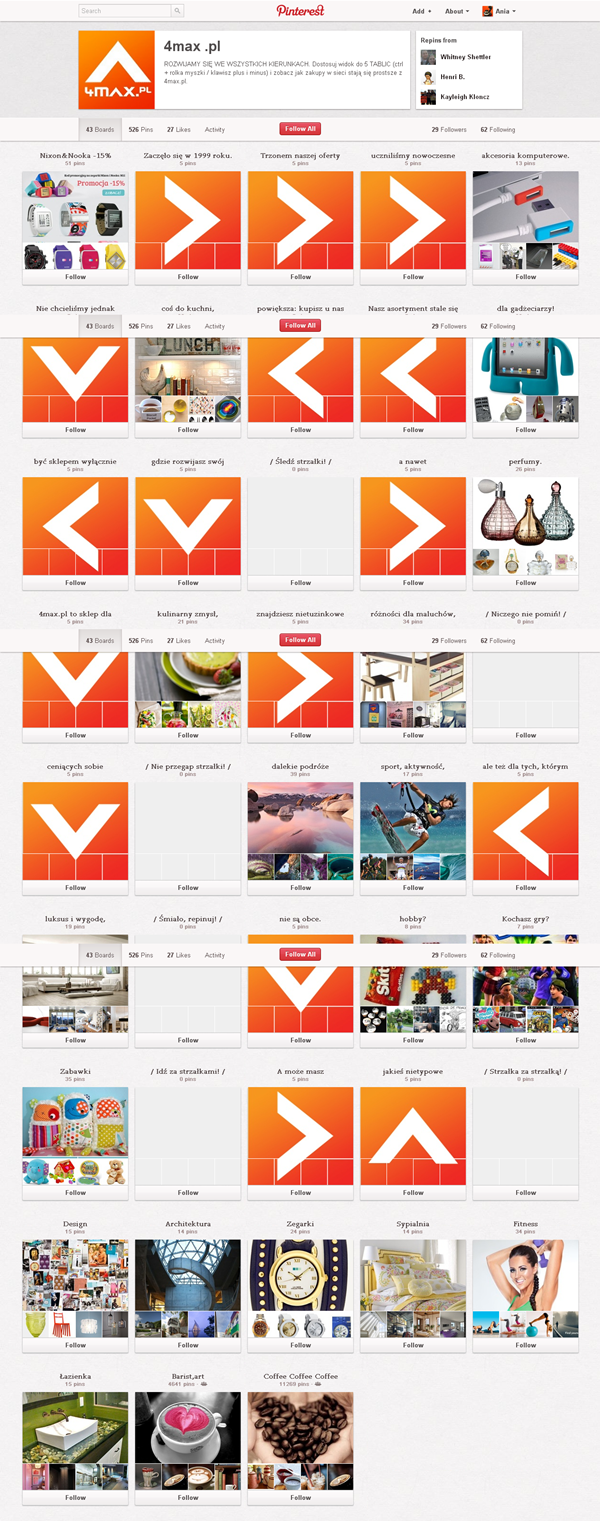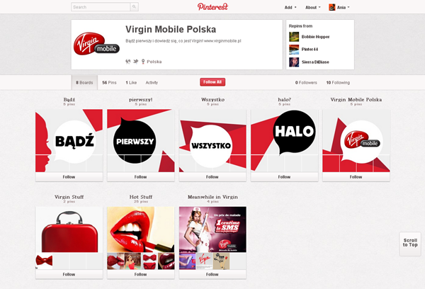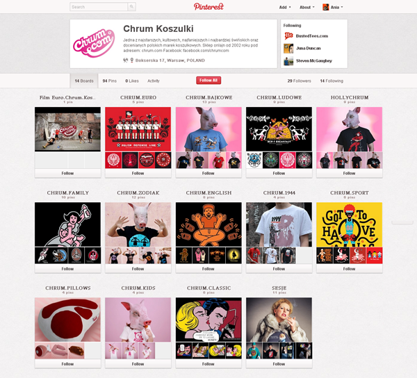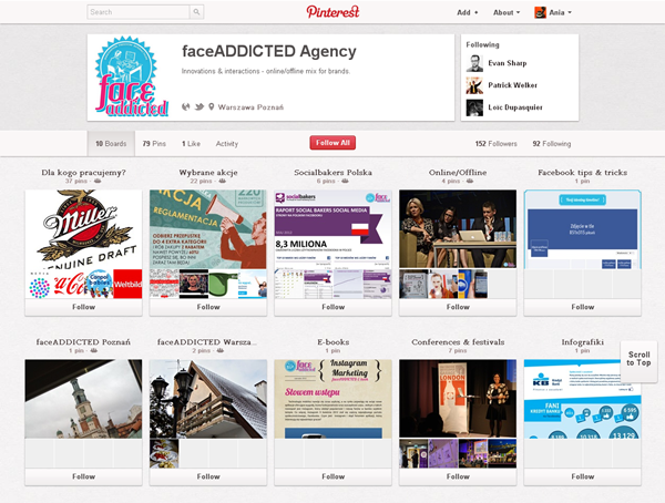 Na Pintereście można znaleźć wiele stron polskich firm związanych z marketingiem, branżą reklamową, PR i social media. Najwięcej osób obserwuje profile: PRovoke (233 followersów), {thinkBIG}, faceADDICTED Agency i Harmonique PR. Swoje konta w tym serwisie mają także: Artweb-Media, Ciszewski MSL, ClickCommunity, Craftonpl, EdelmanPoland, Euro RSCG Sensors, Jamel Interactive, MKI Digital Agency, MSL Social Hive Poland, NetCenter Solution, Newspoint, OXiDE creative agency, Social Media Knowledge, Solski Burson-Marsteller i Zaplecze Kreatywne. Możemy także obserwować konta powiązane z blogami Maltreting, Mediafun, socialmedia.pl czy Święta Dwójca oraz profil NowegoMarketingu 😉