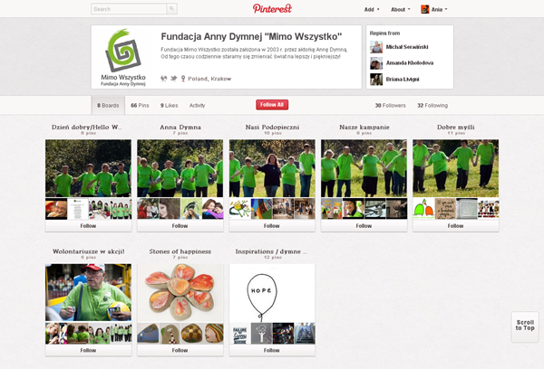 Spośród fundacji, klubów, związków i stowarzyszeń na Pintereście działania prowadzą m.in.: Fundacja Anny Dymnej „Mimo Wszystko”, CHI Polska, Klub Miłośników Czystego Obuwia, PZPN i Stowarzyszenie PAKA.