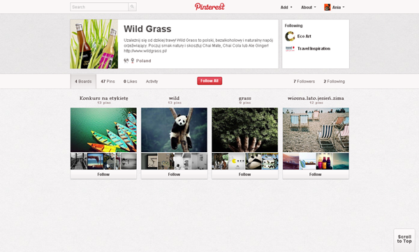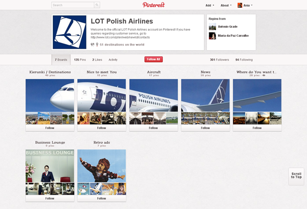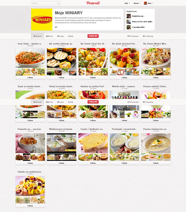 Na Pintereście spośród marek polskich spotkać można LOT Polish Airlines (301 obserwujących), Winiary (171), farby Magnat (111), Mokate, Kasię, Hortex, Grupę PZU oraz Wild Grass, które prowadzi tu i na Facebooku konkurs na etykietę: