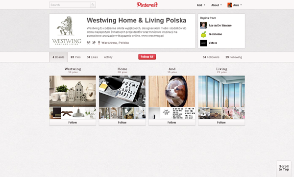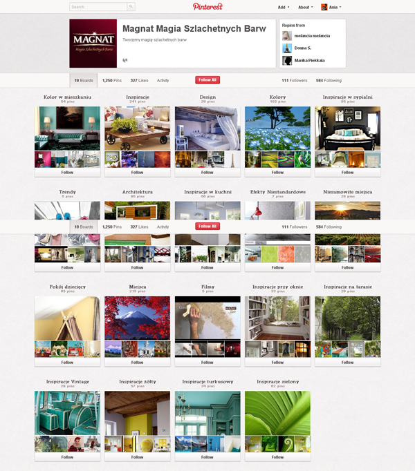 O tym czy marki mają czego szukać na Pintereście pisaliśmy już w maju. Sprawdźmy jak obecnie wyglądają polskie firmowe profile w tym serwisie. Wg statystyk serwisu Repinly średnia to 2472 pinów, 32 boardy i 331 obserwujących.