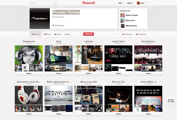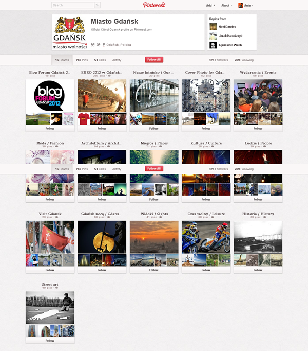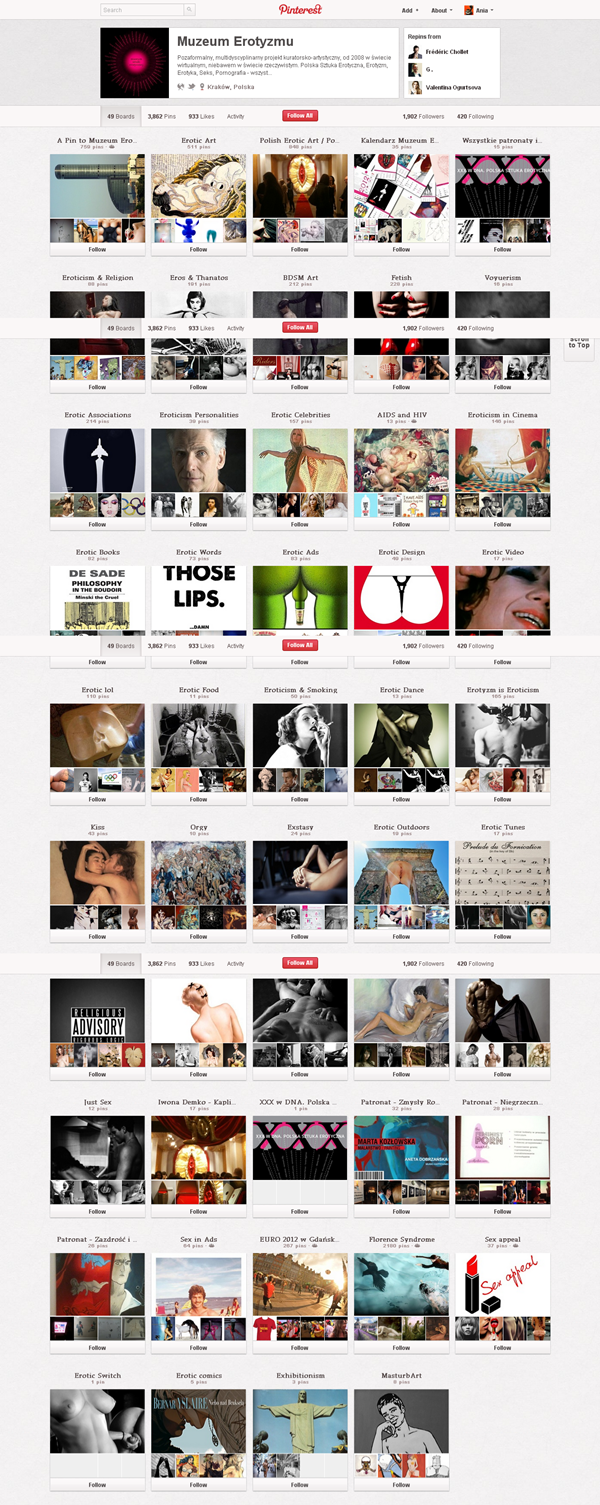 Najpopularniejsze polskie konto na Pintereście to obserwowane przez prawie 2000 osób Muzeum Erotyzmu (jego case study przedstawiliśmy w tym artykule). Swoją działalność kulturalną starają się promować w tym serwisie także Brave Festival, Kino Pod Baranami, Teatr Ochoty, Teatr Łaźnia Nowa i Teatr 6. piętro Warszawa.