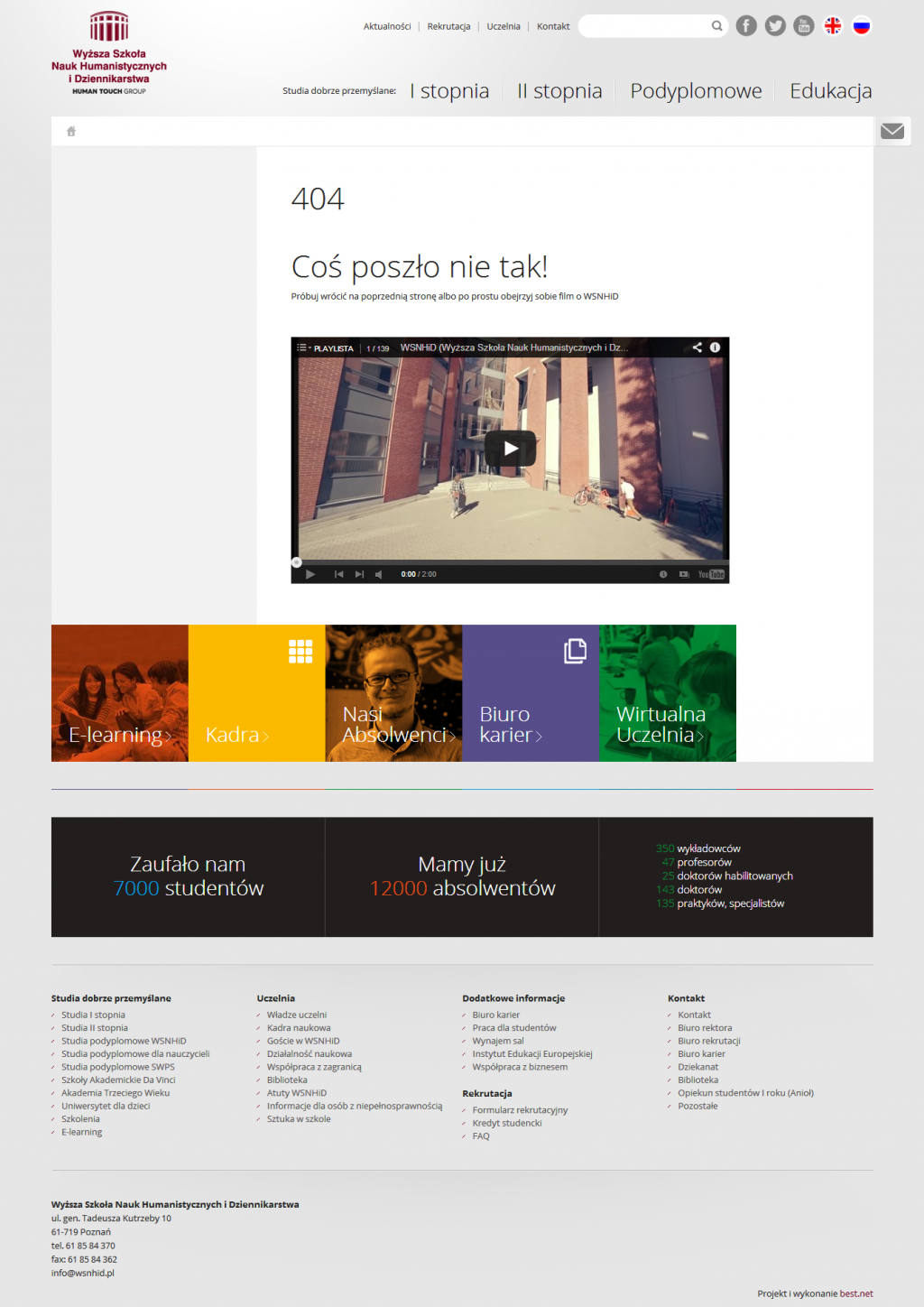 Trafijąc na błędny link na stronie internetowej WSNHiD możemy zobaczyć playlistę ze spotami pokazującymi uczelnię: