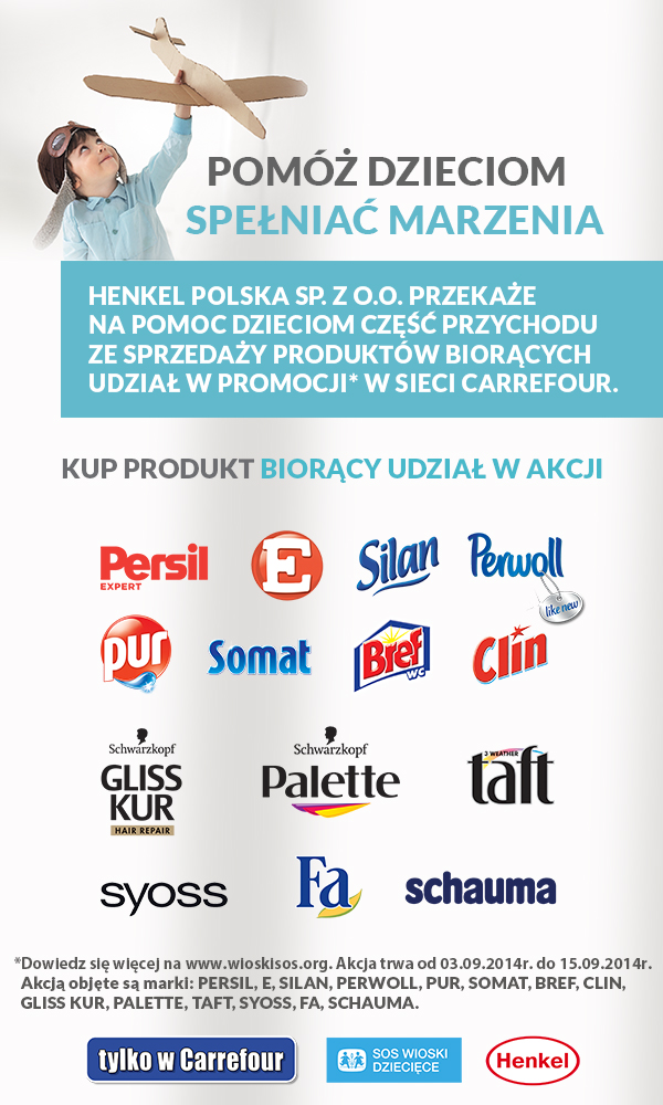 „Planując akcję w sieci Carrefour rozważaliśmy współpracę z kilkoma Fundacjami, Stowarzyszeniami spośród których działalność Stowarzyszenia SOS Wioski Dziecięce okazała się nam najbliższa. W związku z tym, ogromnie cieszymy się, że Stowarzyszenie SOS Wioski Dziecięce zechciało zostać naszym partnerem. Cel jest szczytny – część przychodu ze sprzedaży naszych produktów biorących udział w promocji w sieci Carrefour przekażemy na edukację podopiecznych z SOS Wiosek Dziecięcych. Mamy nadzieję, że możliwość pomocy dzieciom w trudnej sytuacji społecznej, przekona konsumentów do uczestnictwa w akcji.” – mówi Joanna Trzęsiok, Trade Marketing, Laundry & Home Care, Henkel Polska.