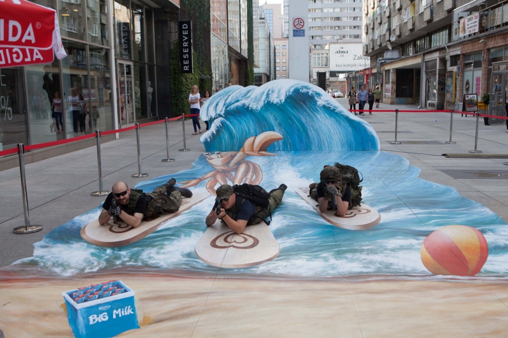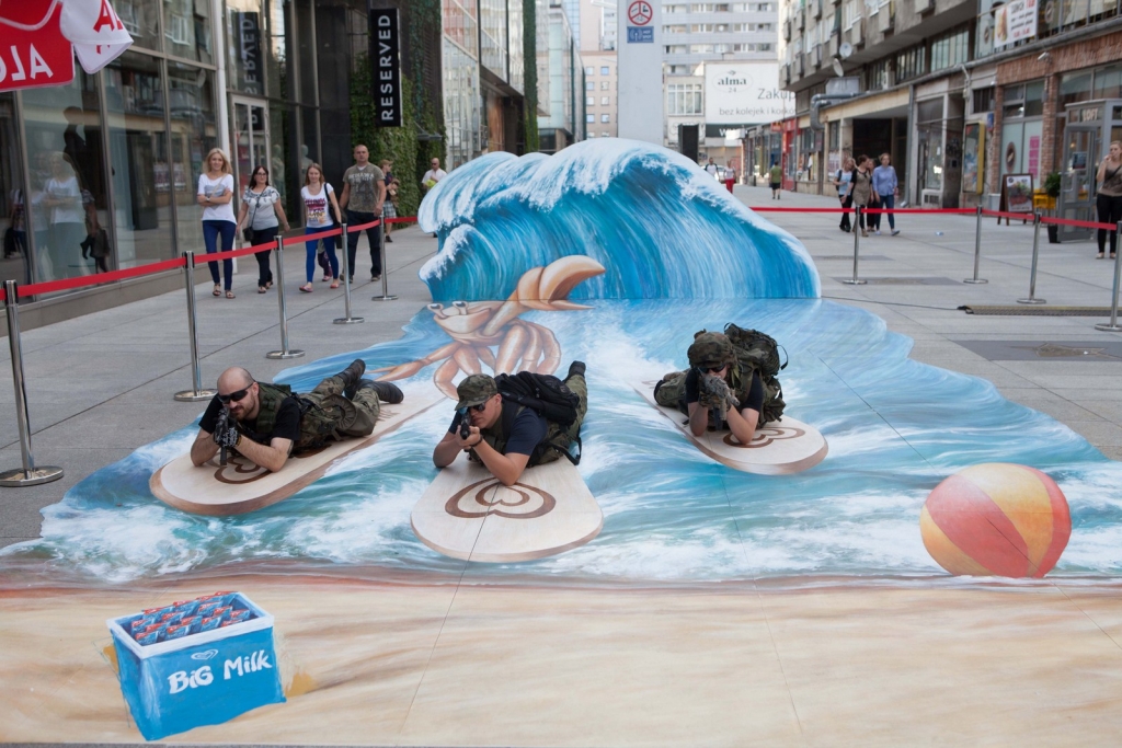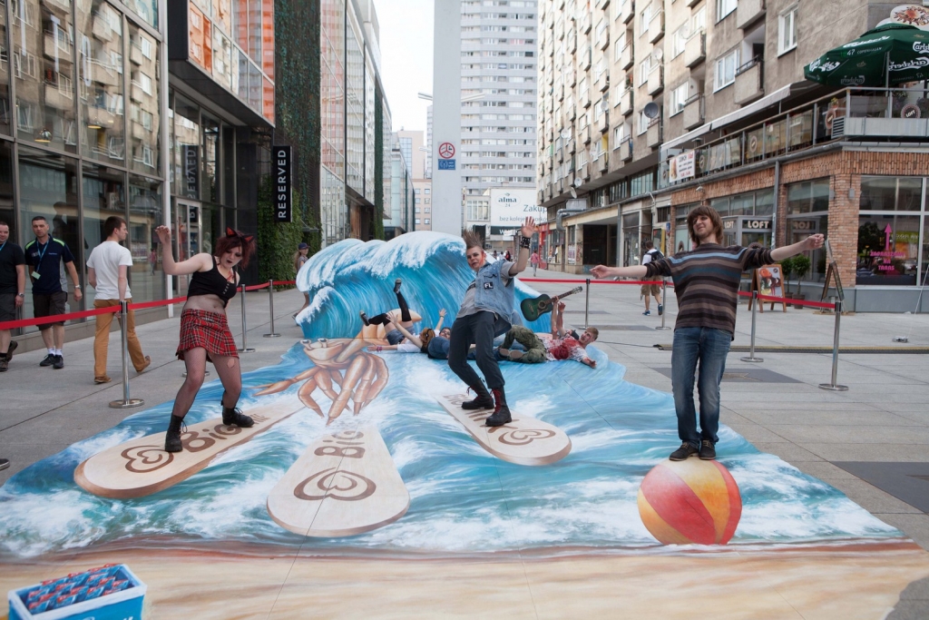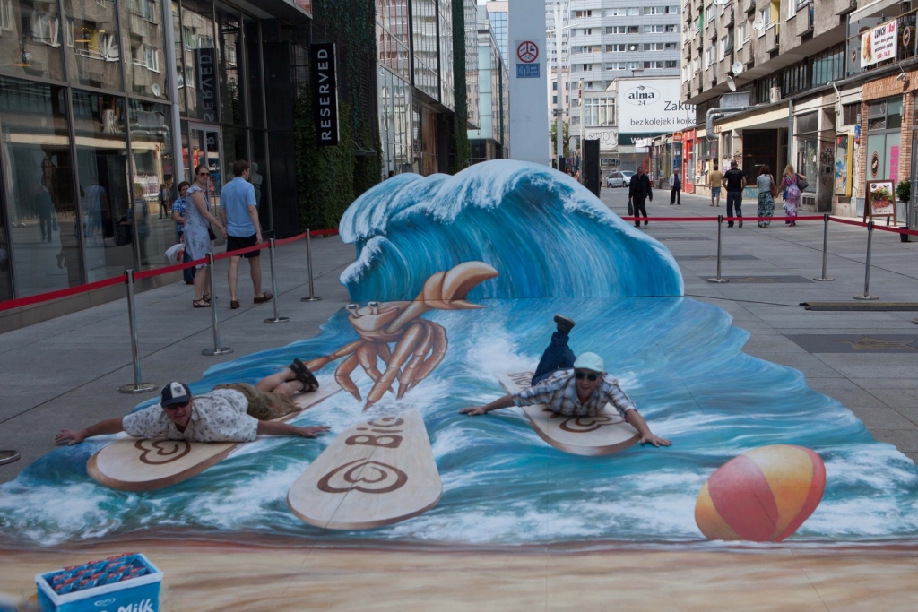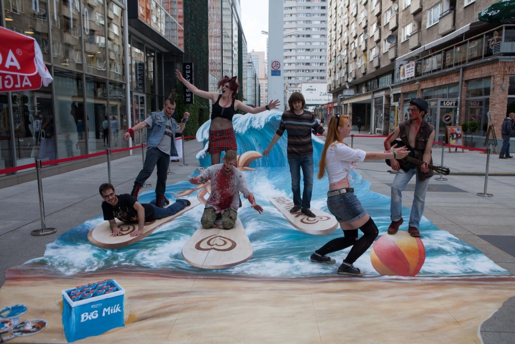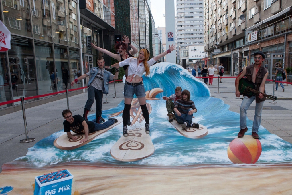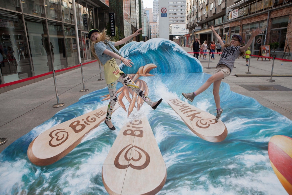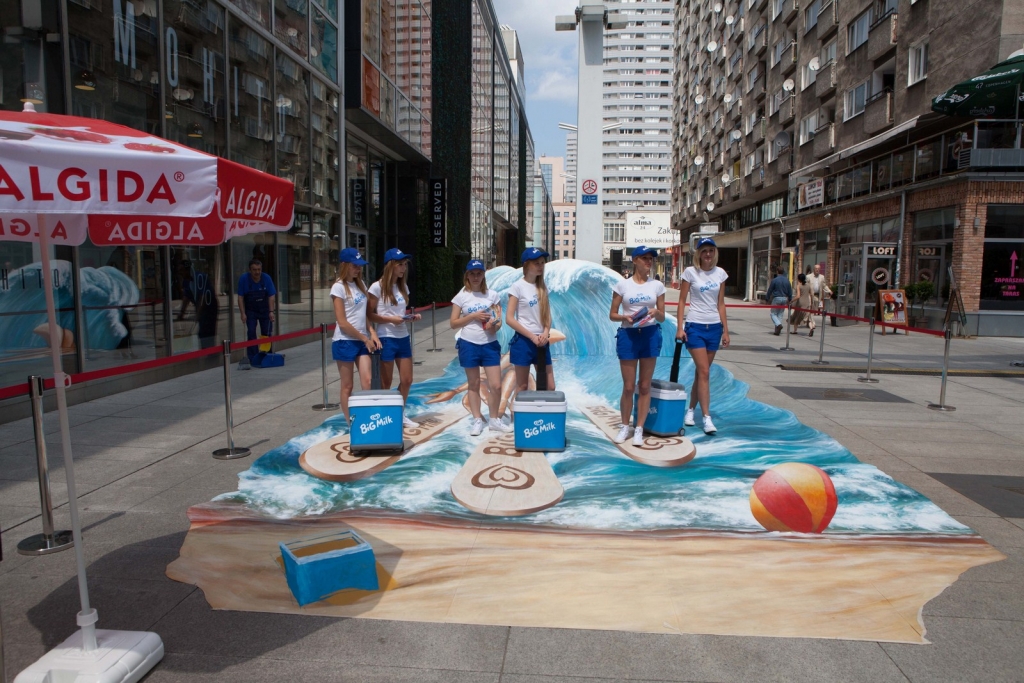 Wakacyjny obraz przedstawiający nowego bohatera kampanii Big Milk – Kraba surfującego po wzburzonych falach został przygotowany w nowatorskiej technologii 3D. Warszawianie chętnie wzięli udział w zabawie i z radością pozowali na tle trójwymiarowego dzieła.