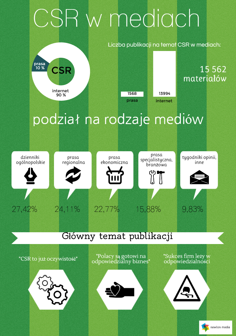NEWTON Media zbadała jak w 2014 roku w polskich mediach postrzegany był temat społecznej odpowiedzialności biznesu. W celu przeprowadzenia badania, spośród publikacji, jakie ukazały się w całym 2014 roku w prasie i na portalach internetowych, wyselekcjonowano te, w których była mowa o CSR, społecznej odpowiedzialności biznesu, odpowiedzialnym biznesie. W badanym okresie na ten temat ukazało się 15 562 publikacji, najwięcej w październiku (1703).