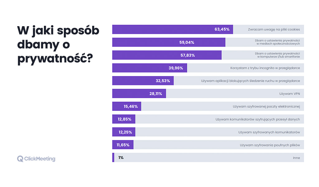 Według przeprowadzonego przez platformę badania, największy odsetek polskich internautów zwraca uwagę na pliki cookies (63,4 proc.). Blisko 60 proc. wskazało, iż dba o ustawienia prywatności w mediach społecznościowych, a 57,8 proc. o ustawienia prywatności w komputerze i/lub smartfonie. Zwracają także uwagę na kwestię przeglądarki, używając w niej trybu incognito (blisko 40 proc.) lub aplikacji blokujących śledzenie ruchu (32,5 proc.), a 28 proc. korzysta z usługi VPN (ang. virtual private network). Część z nich stosuje również takie rozwiązania jak szyfrowana poczta elektroniczna (15,5 proc.), komunikatory szyfrujące przesył danych (12,8 proc.) i komunikatory szyfrowane (12,2 proc.), a 11 proc. deklaruje użycie narzędzi szyfrujących poufne pliki.