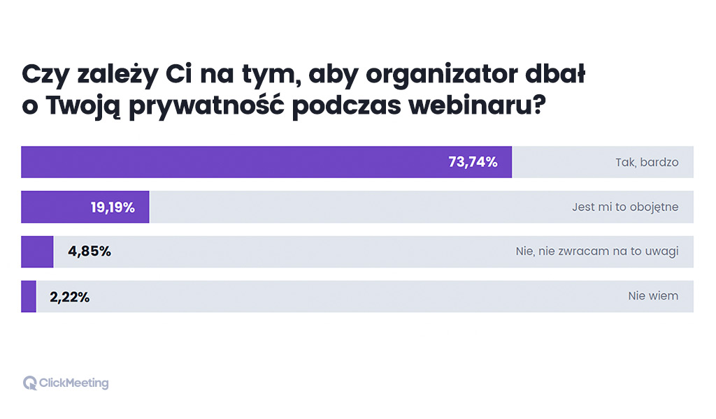 I choć przy wyborze tego typu wydarzeń online przez użytkowników internetu naturalnie kluczową rolę odgrywają kwestie merytoryczne czy zaproszeni eksperci, to ClickMeeting postanowił sprawdzić, jak ważne jest dla ich uczestników kwestia prywatności. Okazuje się, że aż 73,7 proc. badanych chce, by organizatorzy webinarów zadbali o ich prywatność. Obojętne jest to jedynie niespełna 20 proc., a 4,8 proc. zadeklarowało, iż nie zwraca na to uwagi.