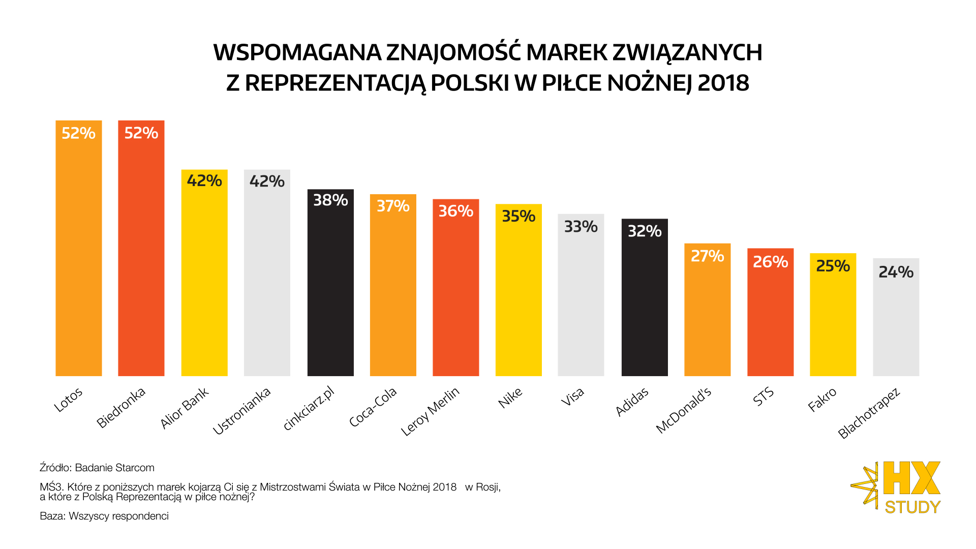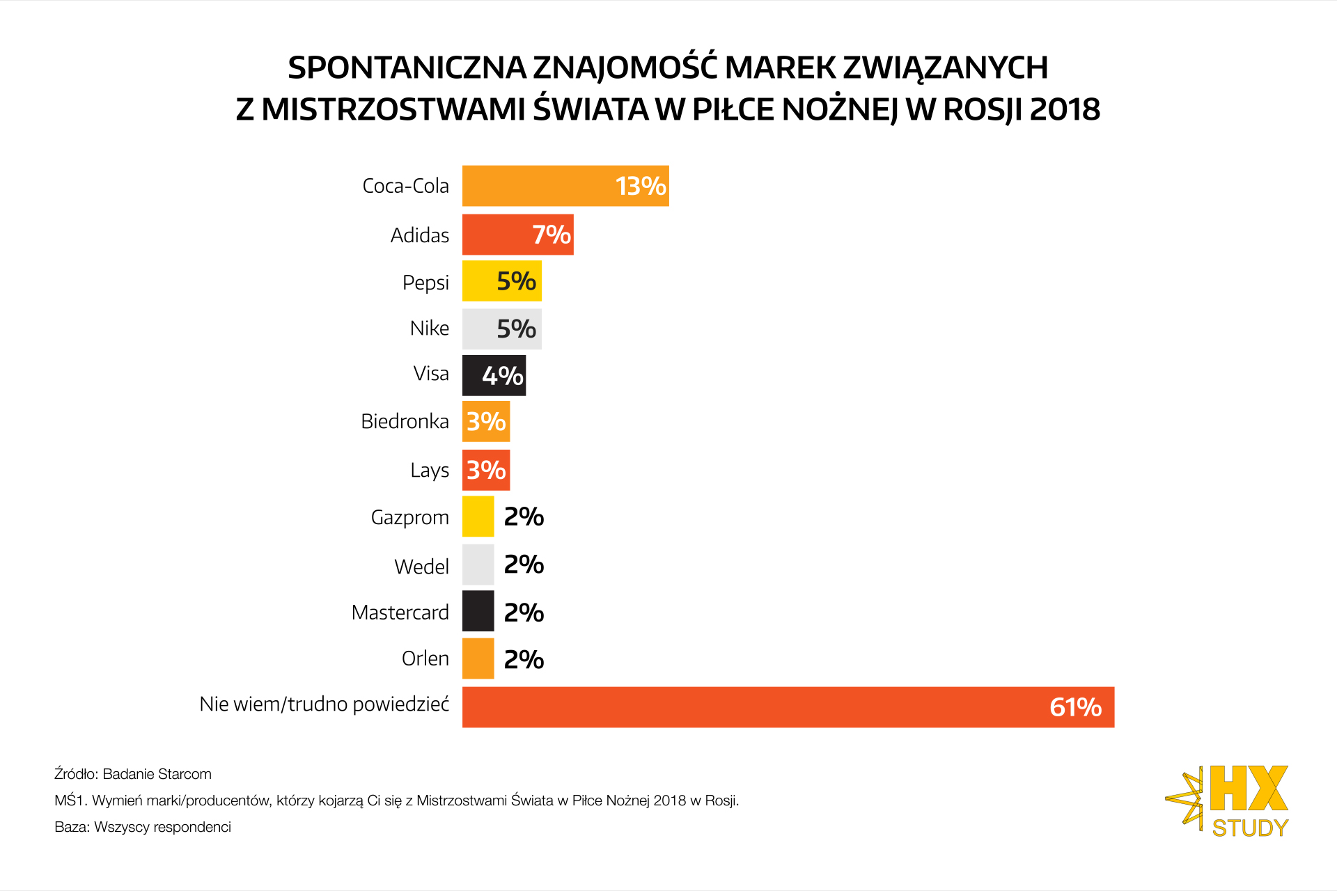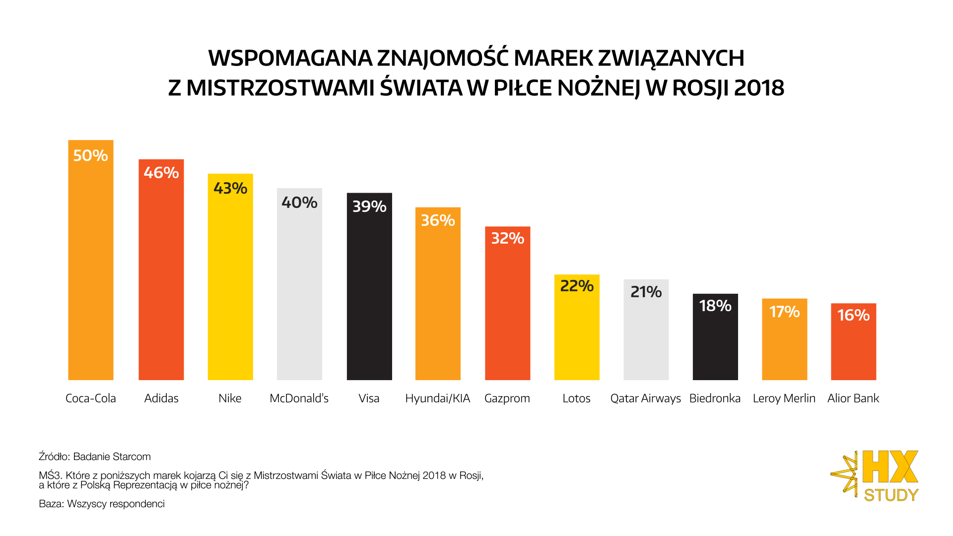 Coca-Cola i Adidas były również najczęściej wskazywane w badaniu znajomości wspomaganej. Pierwszą z marek wymieniło 50 proc. badanych, a drugą 46 proc. Co ciekawe marka Nike, która nie jest oficjalnie związana z FIFA, ale dostarcza sprzęt dla polskiej reprezentacji, pojawiła się na trzecim miejscu zestawienia (43 proc.). Na kolejnych miejscach respondenci wskazali trzy marki, które są sponsorami MŚ 2018 – McDonalds (40 proc.) lub oficjalnymi partnerami FIFA: Visa (39 proc.) Hyundai/KIA (36 proc.).