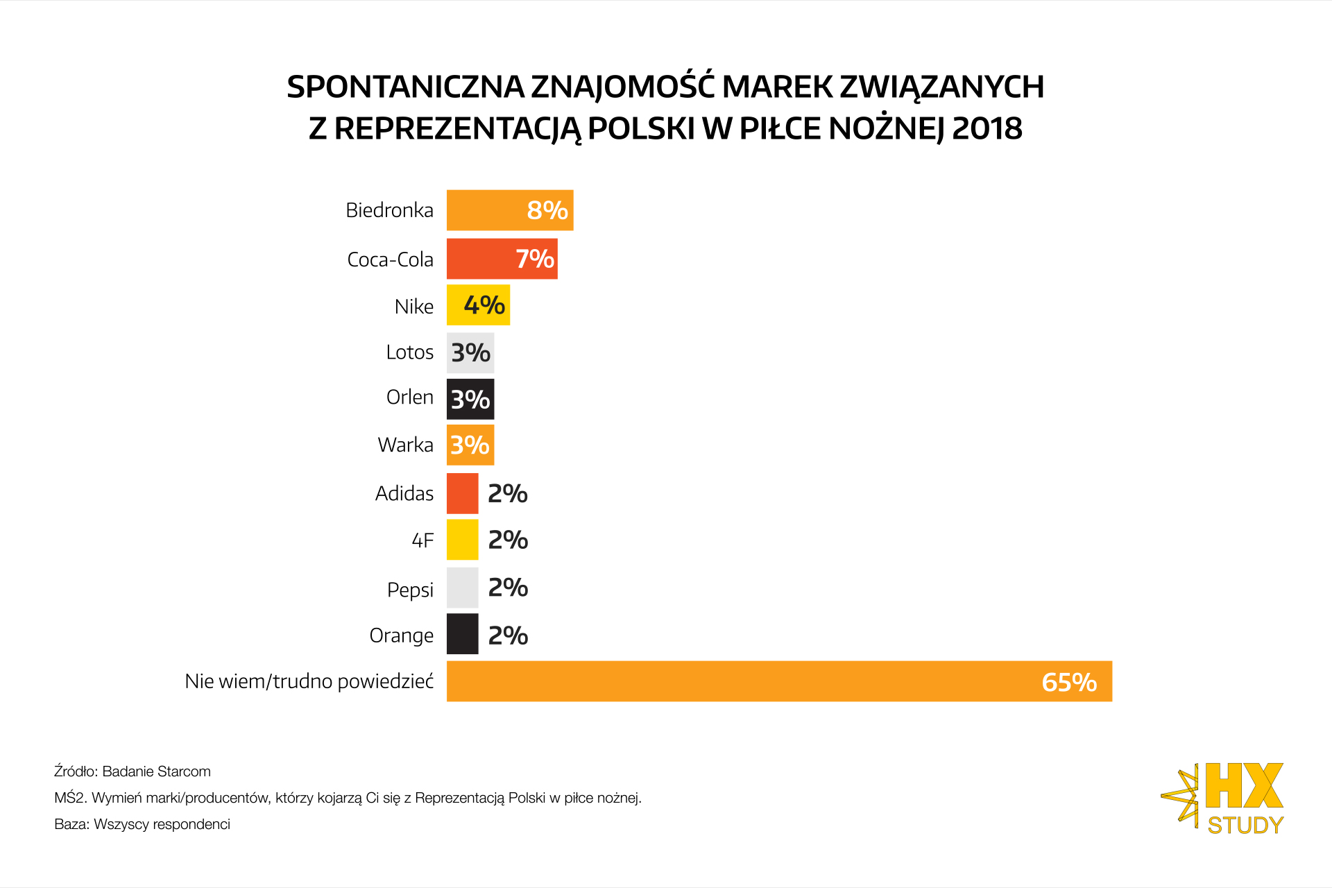 Jeszcze mniej respondentów, niż w przypadku pytania o marki kojarzące się z MŚ 2018, potrafiło spontanicznie wymienić marki, które są związane z polską reprezentacją piłki nożnej. Żadnej marki nie wskazało 65 proc. badanych. Najczęściej wymienianą marką była Biedronka (8 proc.), a kolejne miejsca zajęły: Coca-Cola (7 proc.), Nike (4 proc.) i Lotos (3 proc.)