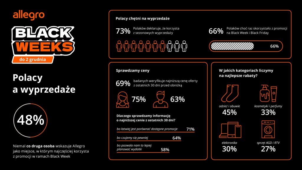Według badania SW Research Allegro jest platformą, która pierwsza przychodzi Polakom (48%) na myśl, gdy chcą zrobić zakupy w ramach Black Week. Podczas festiwalu Black Weeks w 2023 roku ponad 6,5 mln osób skorzystało z rabatów dostępnych na Allegro. Większość badanych (69%) sprawdza, ile dany produkt kosztował przed promocją, weryfikując najniższą cenę z ostatnich 30 dni.