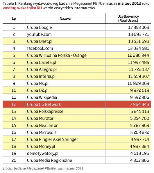 Najnowsze wyniki badania Megapanel pokazują, iż sumaryczna liczba realnych użytkowników korzystających z usług i serwisów GG Network wynosi blisko 8 milionów, a więc znacząco więcej niż w prezentowanych dotychczas badaniach (w których wyniki witryn i aplikacji były prezentowane oddzielnie). Daje to spółce 12. pozycję wśród wydawców internetowych w Polsce.