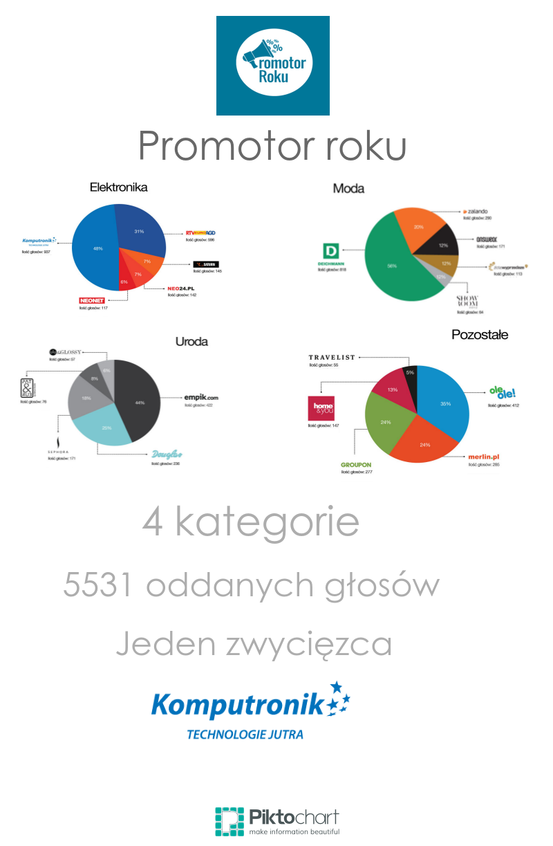 Mianem Promotora Roku 2014 został uhonorowany sklep Komputronik, który zdobył 17 proc. wszystkich głosów. Zwycięska oferta oferowała zniżkę w wysokości 100zł na nowoczesny tablet firmy Acer oraz pakiet Office 365 w prezencie. Kod rabatowy przygotowany przez Komputronik umożliwiał zakup najpopularniejszego ostatnio gadżetu jakim jest tablet, ze zniżką około 13 proc. w porównaniu do ceny rynkowej. Tego typu oferty są prawdziwą okazją dla kupujących i zawsze cieszą się dużą popularnością – mówi Małgorzata Zimoch, ekspert od zakupów w CupoNation. Poza samą ofertą użytkownicy docenili w komentarzach wysoki poziom obsługi klienta oraz niskie ceny. Jakość usług oferowanych przez Komputronik została również nagrodzona w rankingu Money.pl na najlepszy sklep internetowy 2014, gdzie Komputronik zajął pierwsze miejsce wśród sprzedawców elektroniki i AGD. W plebiscycie na Promotora Roku 2014 kategoria elektronika cieszyła się największą popularnością wśród respondentów (35 proc. wszystkich głosów). Wynika to z faktu, iż to właśnie na ten rodzaj produktów polscy e-konsumenci wydają najwięcej pieniędzy1.