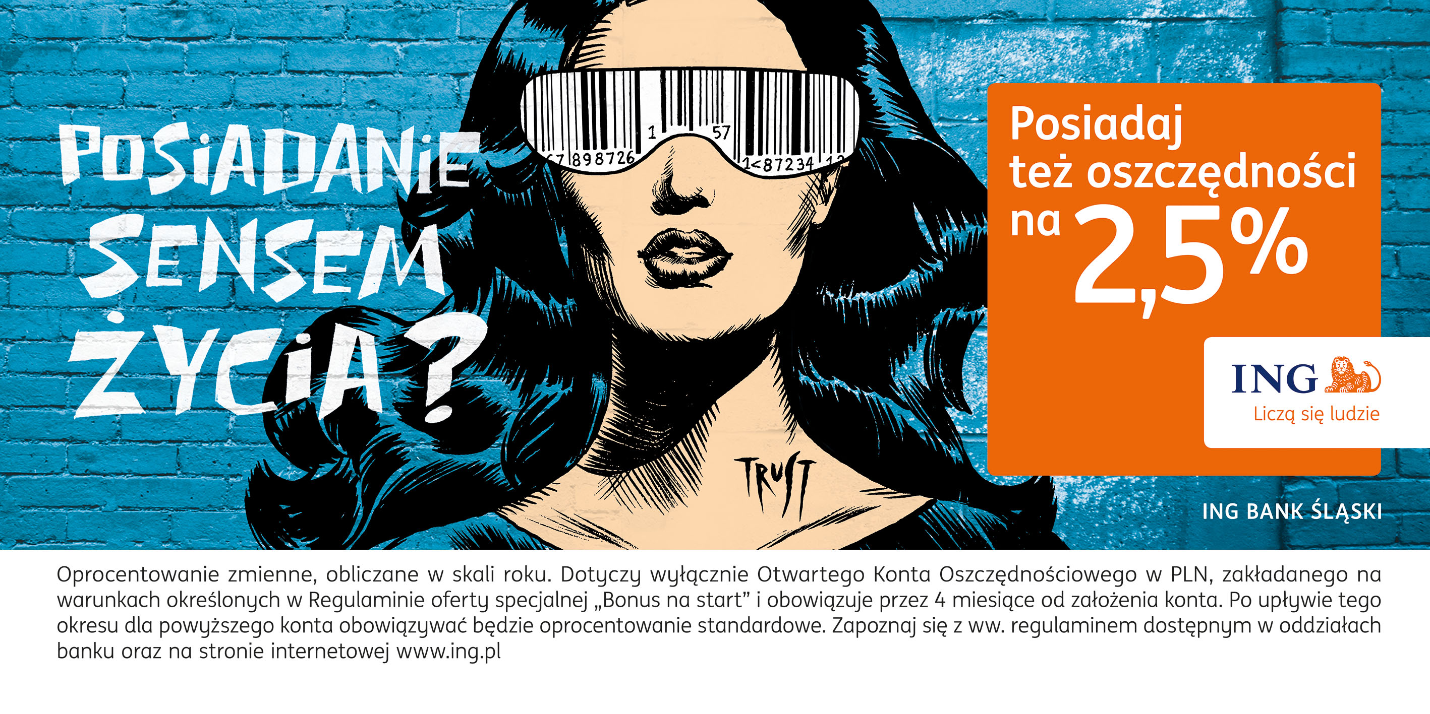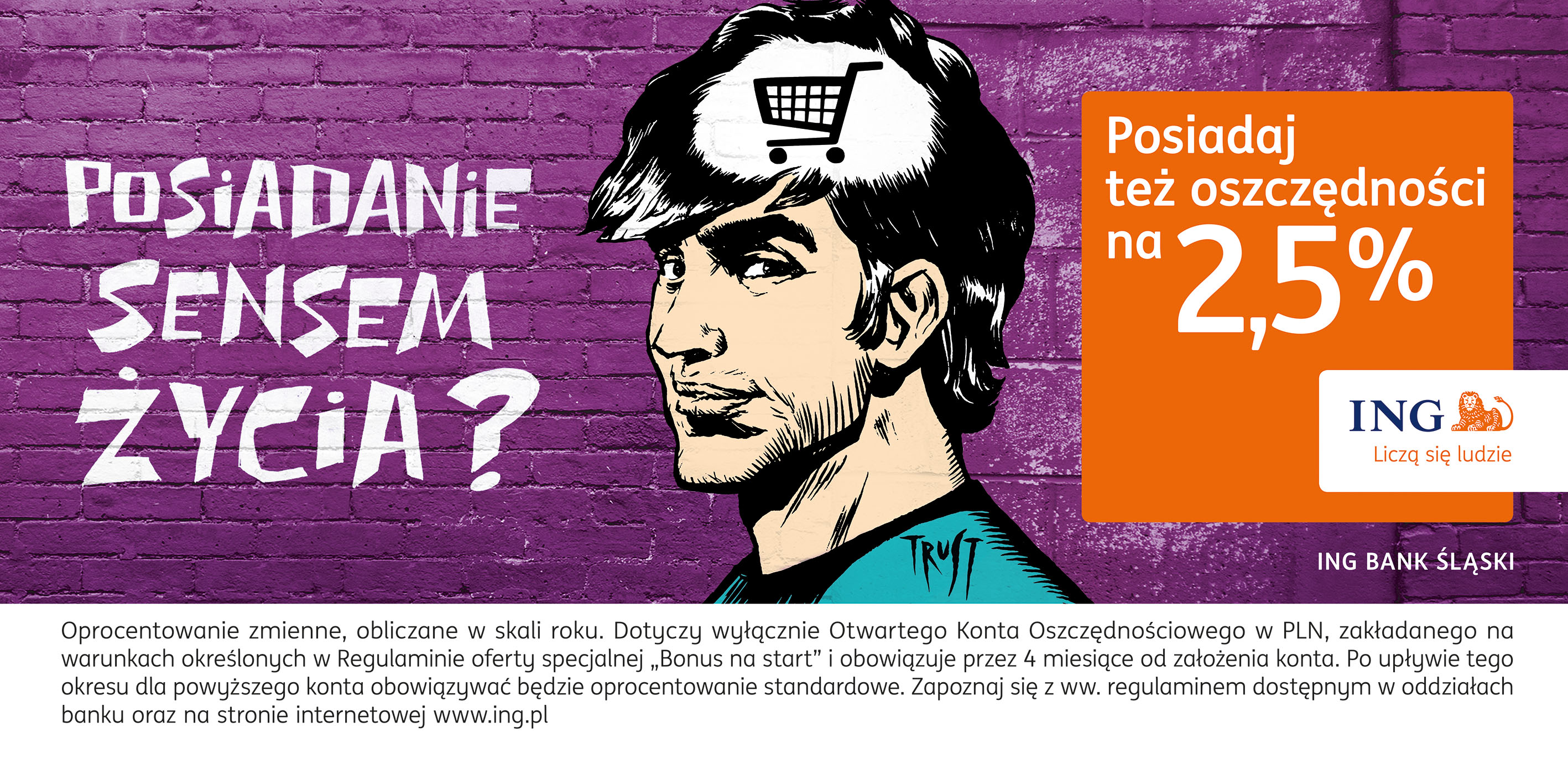 – Chcemy głośno i szeroko podnosić temat świadomego konsumowania, stąd nasza obecność w przestrzeni publicznej: na dużym formacie oraz na warszawskich wiatach przystankowych i w metrze. O zobrazowanie tematu poprosiliśmy znanego artystę i rysownika komiksowego Przemysława Truścińskiego. Jego wizja w symboliczny sposób pokazuje zaślepienie konsumpcją. Na drugim biegunie są przemyślane i odpowiedzialne zakupy – trend który, jako marka wspieramy i promujemy – powiedziała Barbara Pasterczyk, dyrektor Banku odpowiedzialna za komunikację marketingową w ING Banku Śląskim.