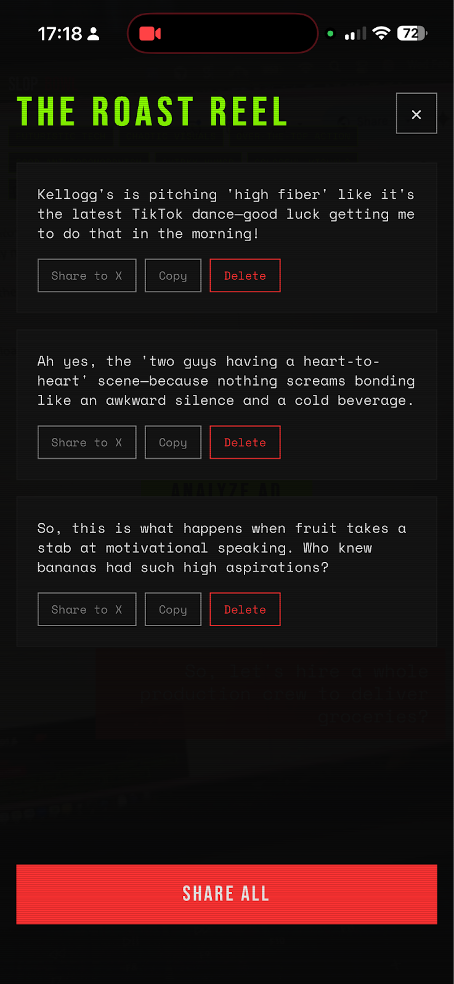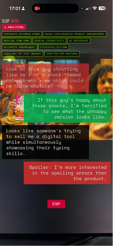 Aby użyć SlopBowl, wystarczyło skierować telefon na dowolną reklamę podczas Super Bowl, a narzędzie skomentowało ją w czasie rzeczywistym – tak jakbyś na kanapie obok siedział znudzony koneser reklam, który widział już wszystkie sztuczki, ale nadal szanuje to rzemiosło. Dzięki technologii GPT Vision SlopBowl oglądał mecz razem z użytkownikiem, dostarczając krótkie komentarze.