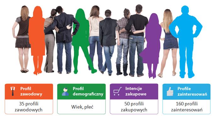 - profile behawioralne: informacje o zachowaniu użytkowników w sieci: czytanych artykułach, przeglądanych kategoriach na portalach i sposobie poruszania się po serwisach internetowych,