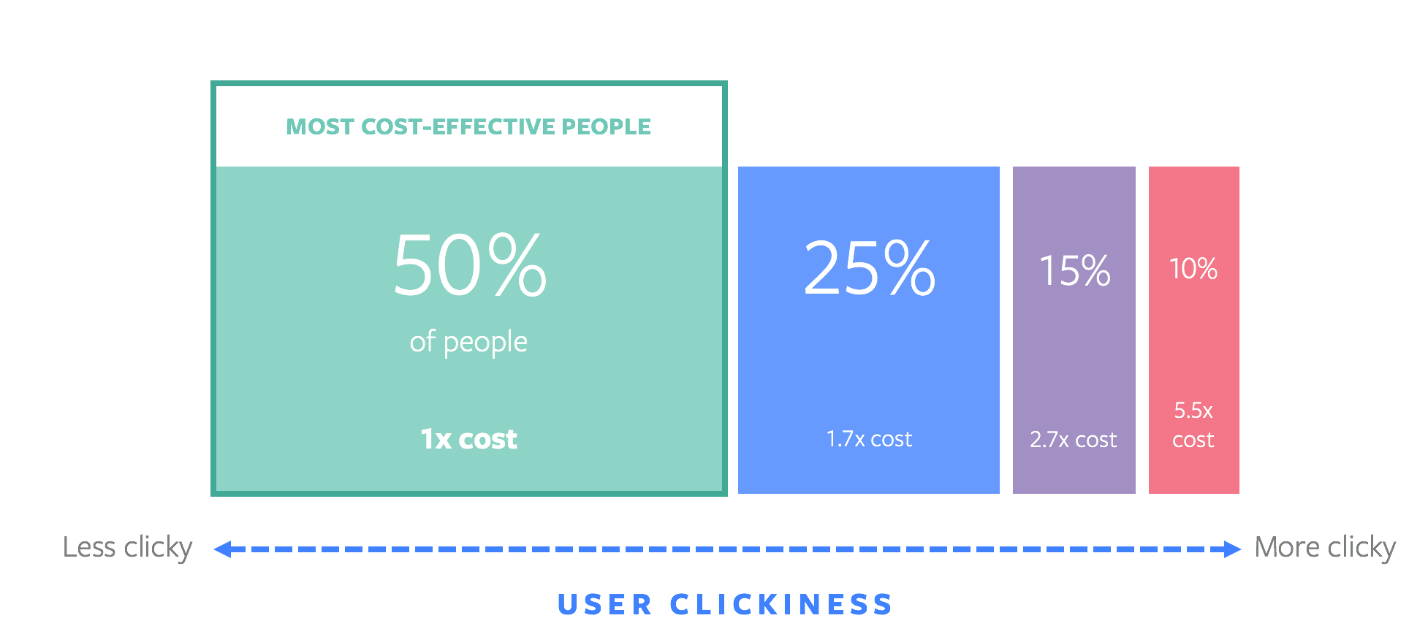 Wykres poniżej pokazuje wyniki wewnętrznego badania przeprowadzonego przez Facebooka w USA. Ukazują one relatywny koszt CPM (tzw. cost-per-mille, jednostką jest tysiąc odbiorców) dotarcia do najaktywniej klikających użytkowników Facebooka w porównaniu z tymi, którzy klikają najmniej.