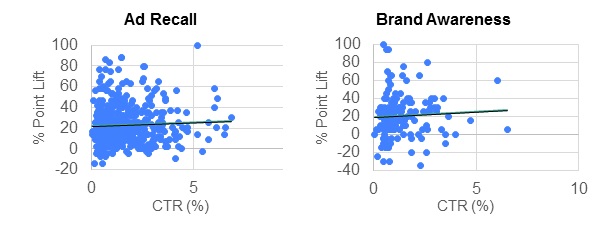 Facebook, razem z firmą badawczą Nielsen, przeprowadził badania nad współzależnościami pomiędzy klikami a markami i wynikami sprzedaży. Na infografice poniżej każda kropka oznacza kampanię marketingową. Grafika przedstawia związek pomiędzy kliknięciami (click rate) odbiorców kampanii a wzmocnieniem marki (brand lift), zmierzonym za pomocą Brand Effect, narzędzia Nielsena.