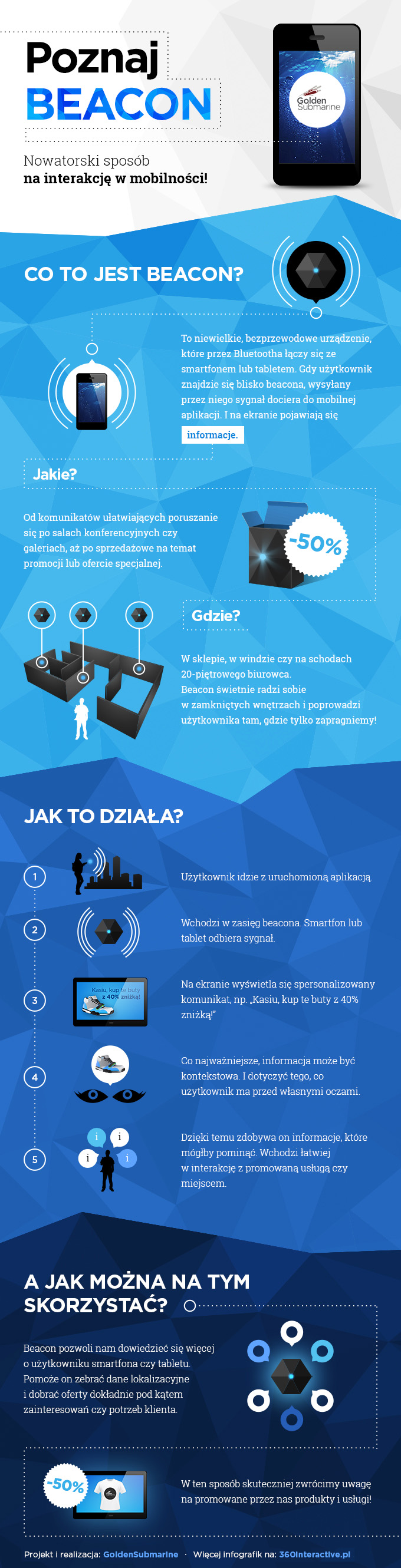 Agencja interaktywna GoldenSubmarine stworzyła inforgrafikę odpowiadającą na pytania: co to jest Beacon, jak działa oraz jak można z niego skorzystać.