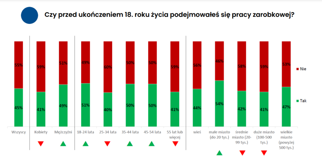 Raport pt. „Praca dzieci w Polsce. Jak młodzi nabywają swoje pierwsze doświadczenia zawodowe?” jasno mówi o tym, że aż 75% badanych rozpoczęło pracę (zwykle dorywczą) już między 15. a 16. r.ż. Co ciekawe, częściej robili to mieszkańcy małych ośrodków niż dużych miast (54% vs. 41%). Największym zainteresowaniem cieszyła się praca sezonowa, m.in. przy zbiorach warzyw i owoców (47%).