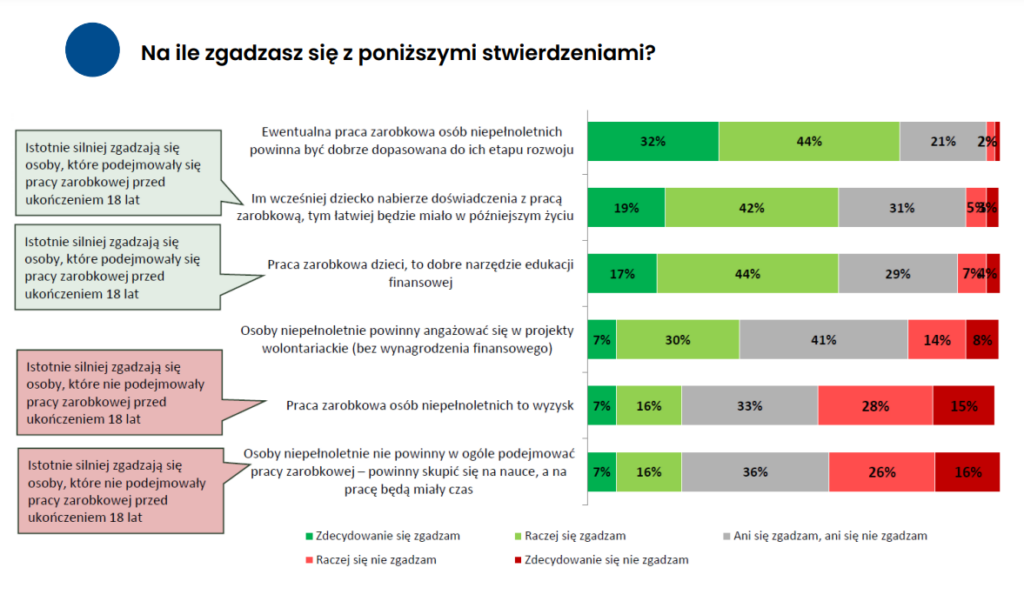 Najogólniej mówiąc, stosunek Polaków do pracy osób niepełnoletnich jest raczej pozytywny. Według 61% badanych, aktywność zawodowa w tak młodym wieku może pomóc na kolejnych etapach życia, a dodatkowo jest to doskonałe narzędzie do edukacji finansowej i wzrostu świadomości znaczenia pieniądza.
