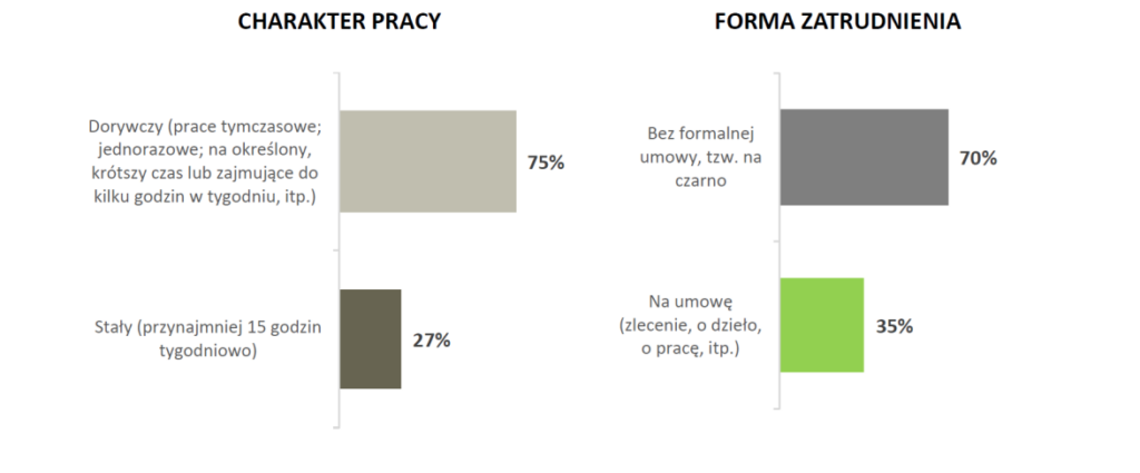 Młodociani Polacy pracują przede wszystkim w szarej strefie, tj. bez żadnej formalnej umowy. Taką sytuację deklaruje aż 70% badanych, którzy postanowili podjąć pracę przed 18. urodzinami. Jeżeli już pracodawca decyduje się w ich przypadku na podpisanie umowy, najczęściej mowa o umowie o dzieło, czyli tzw. śmieciówce.