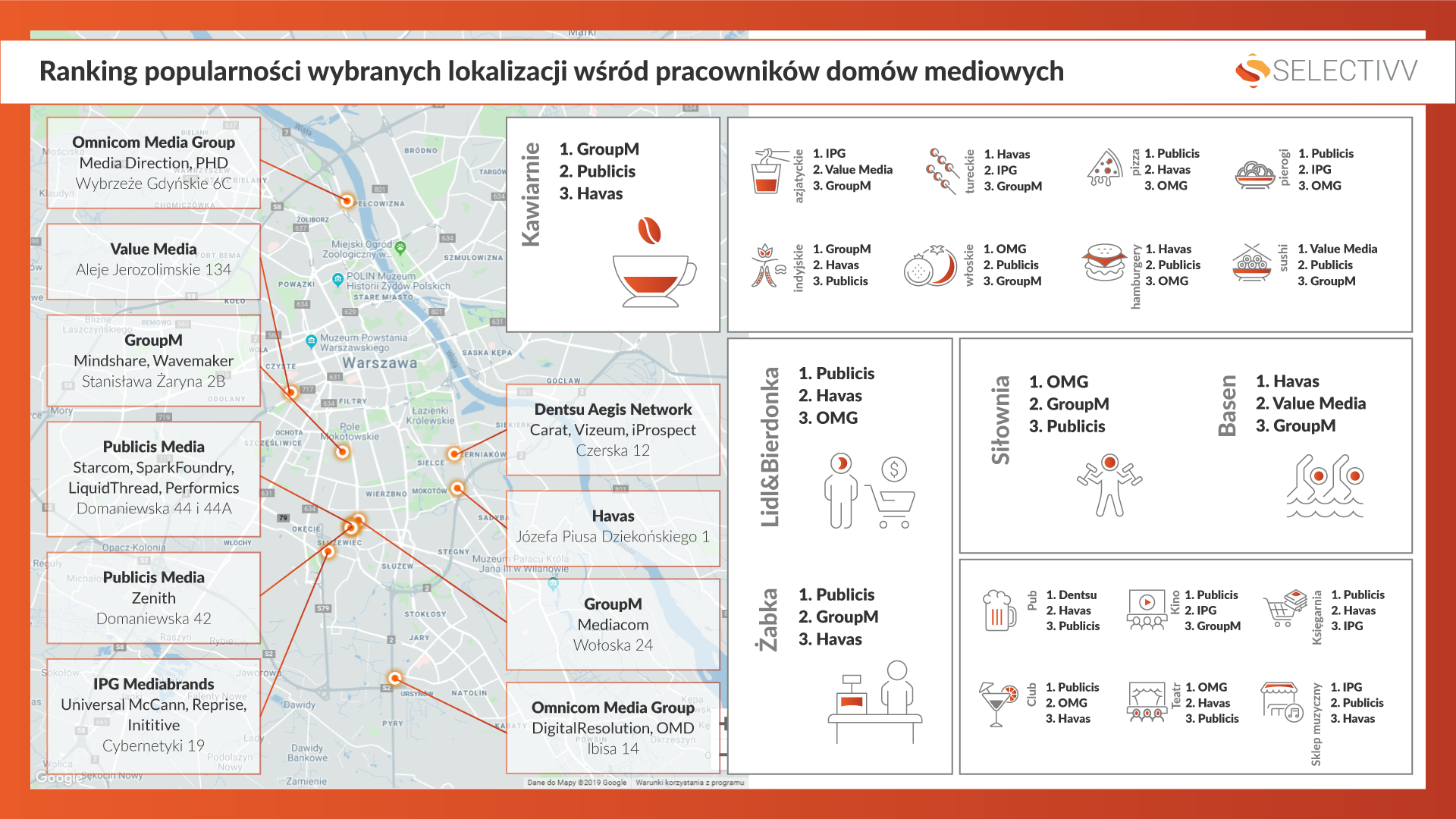 Firma Selectivv posiadająca zbiór danych z mobile obejmujący informacje o 14 mln użytkowników w Polsce, postanowiła sprawdzić zachowania jakie charakteryzują określoną grupę osób. Wybór padł na pracowników największych domów mediowych w Polsce. Ponieważ siedziby tych firm znajdują się w Warszawie, założono, iż cała grupa będzie odznaczała się dość zbliżonym stylem życia i będzie odwiedzała podobne miejsca. Czy tak faktycznie jest? Wybrano kategorie lokalizacji, które okazały się najczęściej odwiedzane przez badaną grupę. W ten sposób powstał ranking domów mediowych wg. wybranych kategorii miejsc, a wyniki zamieszczone zostały na poniższej infografice.