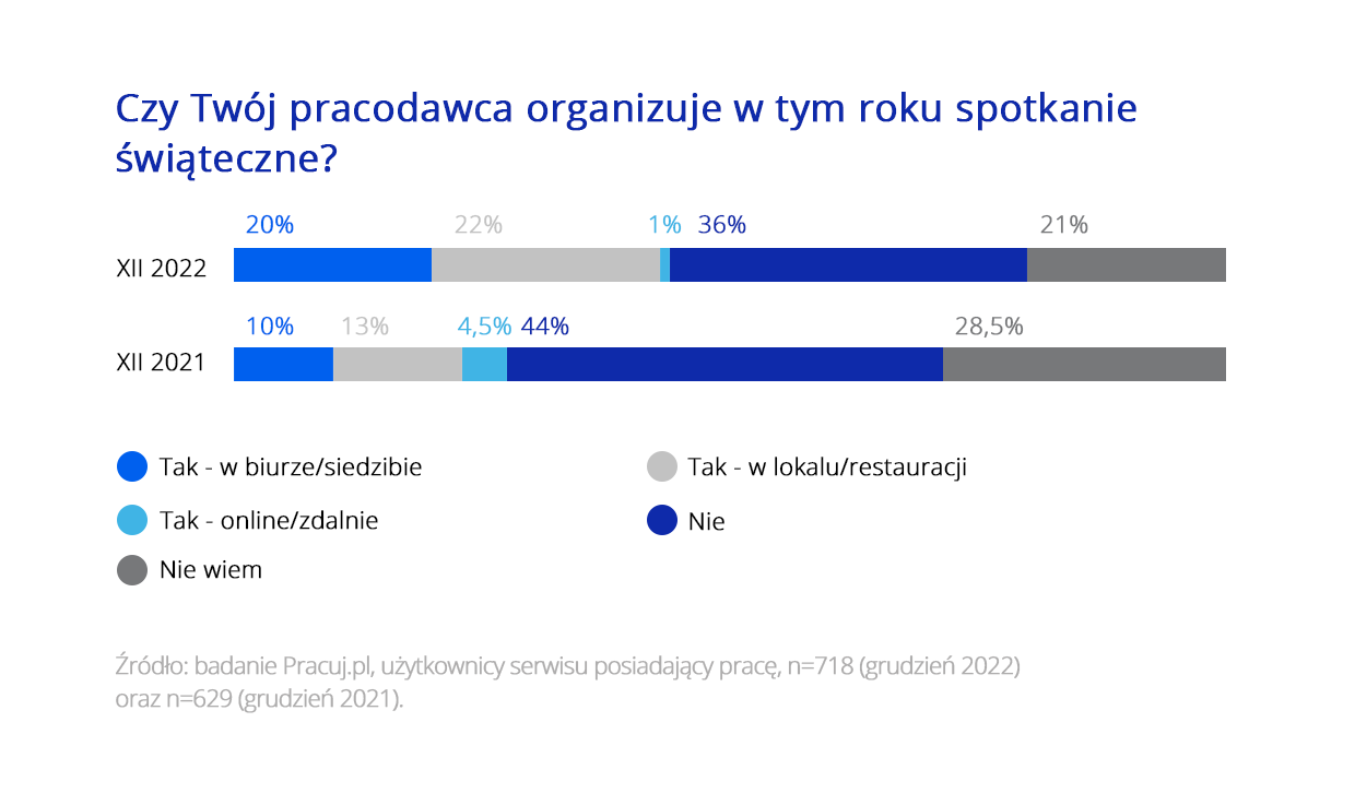 Badanie Pracuj.pl wskazuje, że w obliczu osłabienia się pandemii koronawirusa, a także mimo oszczędności części pracodawców, firmy stosunkowo odważnie wracają do organizacji świątecznych spotkań. 43% respondentów deklaruje, że w ich miejscu zatrudnienia odbędzie się takie wydarzenie. Dla porównania, przed rokiem było to znacznie mniej, bo 27%. Co interesujące, tego typu spotkań ostatecznie może być nawet więcej. Na początku grudnia br. ponad 1/5 respondentów nie wiedziała jeszcze, jakie plany świąteczne dla zespołu ma ich pracodawca. Część z nich organizację tego typu wydarzenia mogła odłożyć na ostatnią chwilę.