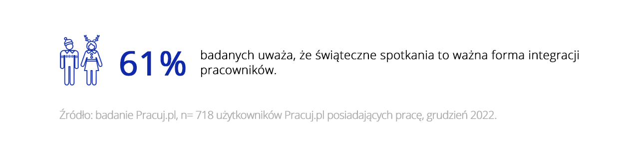 Realne świąteczne spotkania ze współpracownikami w innej atmosferze, niż na co dzień pozostają jedną z najlepszych form integracji zespołu i budowy pozytywnych relacji. Z taką opinią zgodziło się 61% respondentów Pracuj.pl. Jak komentuje Agata Grzejda, ekspertka ds. komunikacji wewnętrznej w Grupie Pracuj, powroty świątecznych imprez są pozytywnym sygnałem płynącym z rynku pracy.